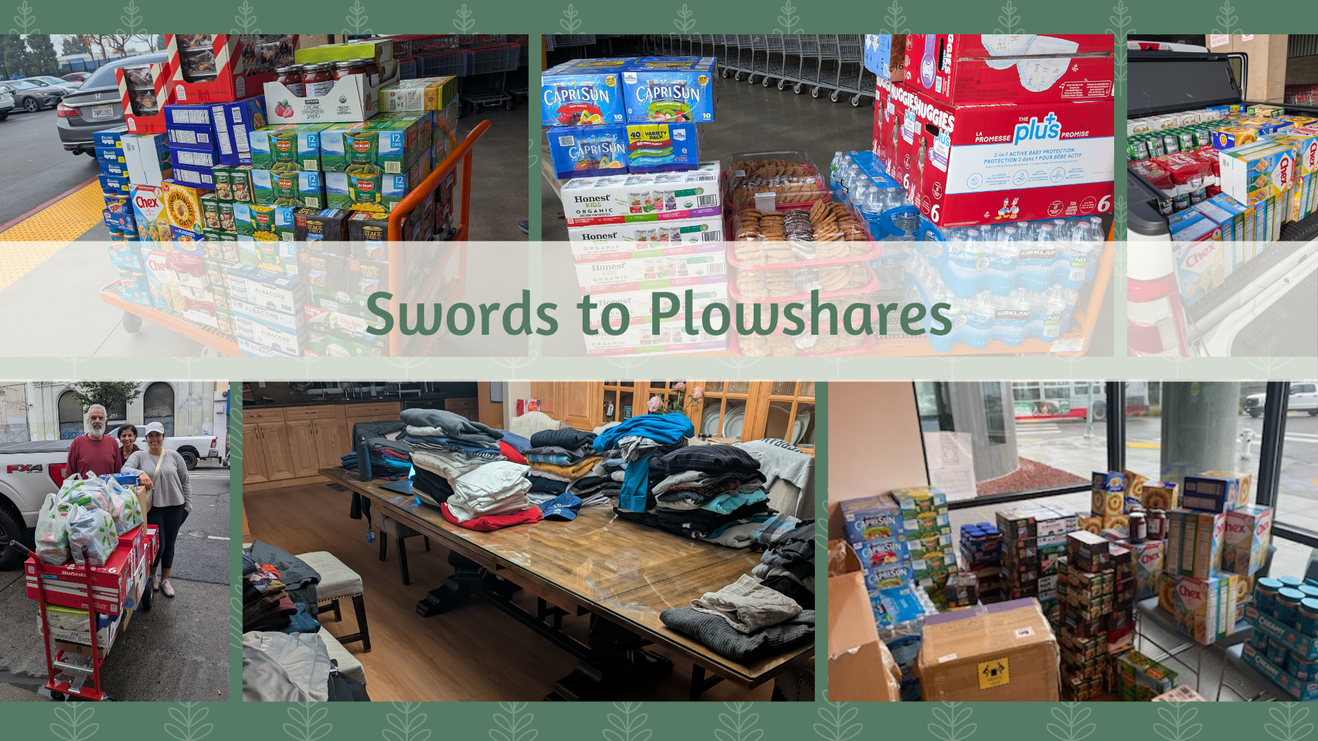 - Swords to Plowshares has a need for frozen and non-perishable foods as well as clothing. So, if you have any coats or jeans you no longer use/wear that are in good condition and washed, we can coordinate a dropoff to my house.