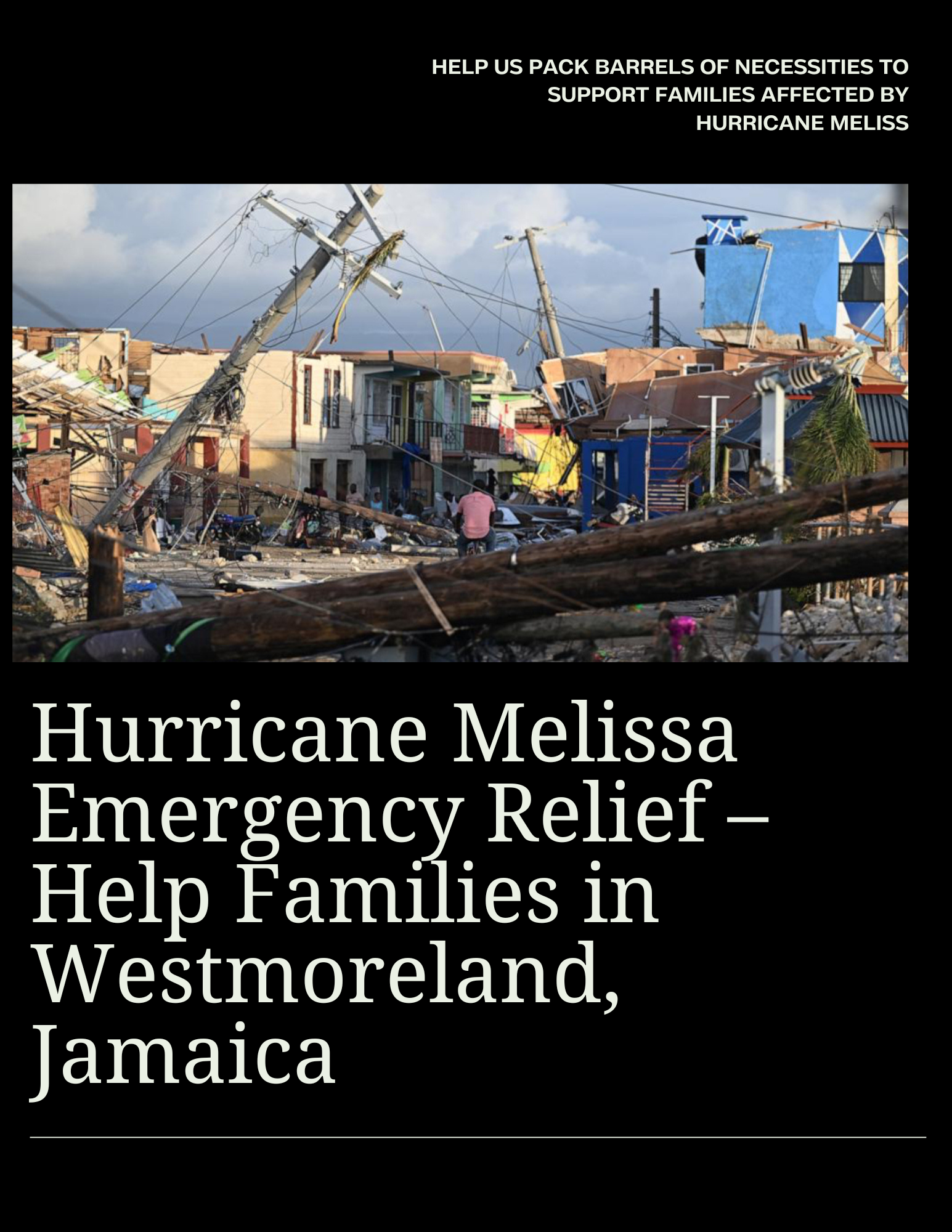 Hi, my name is Sudaine. Hurricane Melissa in Westmoreland has left so many families, including my own devastated & homeless. So many families have lost everything, homes washed away with clothes, food, and all their belongings gone. Children are completely homeless, sleeping outside with nowhere to go.