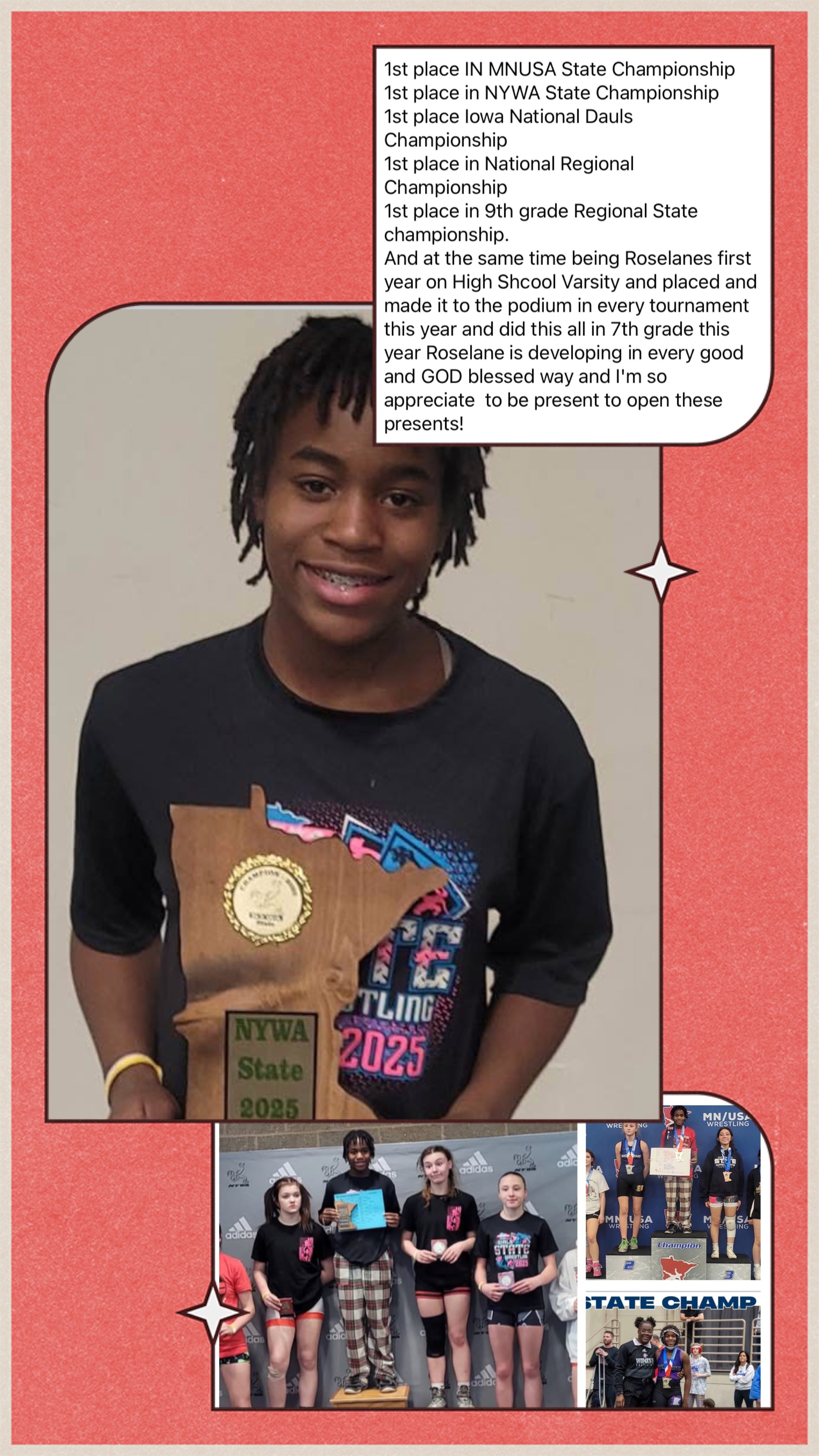 Our names are Roseangel and Roselane, and we are excited to share that we have the incredible opportunity to represent our city and state on the Minnesota National Wrestling Team in Westfield, Indiana, and Fargo, North Dakota. We are reaching out to seek your support in raising funds to help make our dreams a reality. Your generosity will play a vital role in our journey, and we deeply appreciate any assistance you can provide. Thank you for believing in us and for helping us chase our dreams!