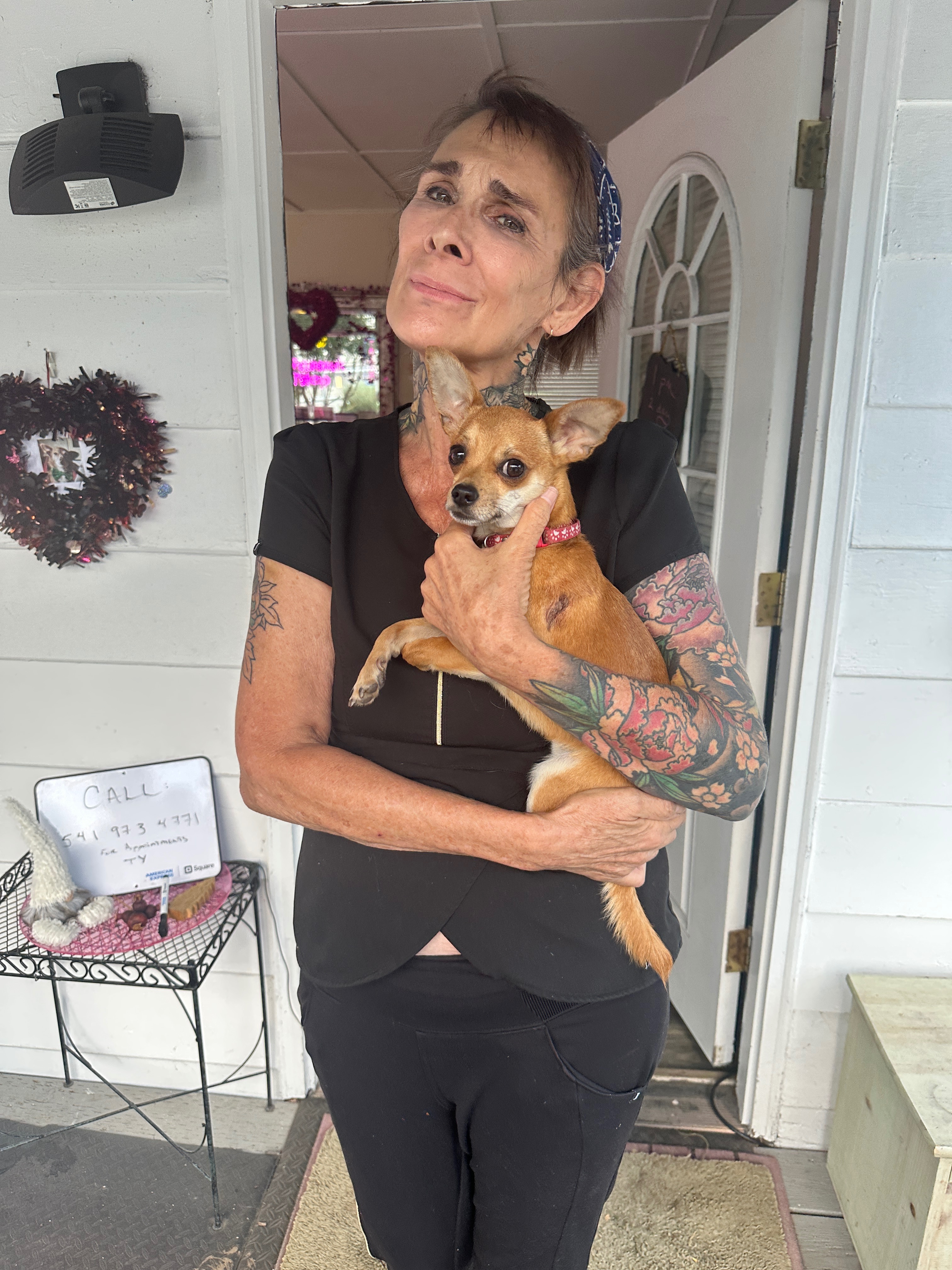 Last week, my dogs and I found a tiny Chihuahua puppy cowering and bleeding on my property in Ashland. I brought him in, checked him for major injuries, and cleaned his wounds. Poor little guy was terrified, malnourished, and exhausted. I put up pictures on Facebook and Nextdoor looking for his family and got a lot of social media love, but no one knew him. He had been sighted a couple of days earlier on the railroad tracks in Ashland. I had a few immediate offers to foster him, and since I have 5 large rescue dogs, I brought him to Britta, a local artist who had recently lost her senior Chihuahua. She took him to a vet when his wounds looked infected, and he was feverish and not doing well. He has clearly been neglected or living feral for a while.
