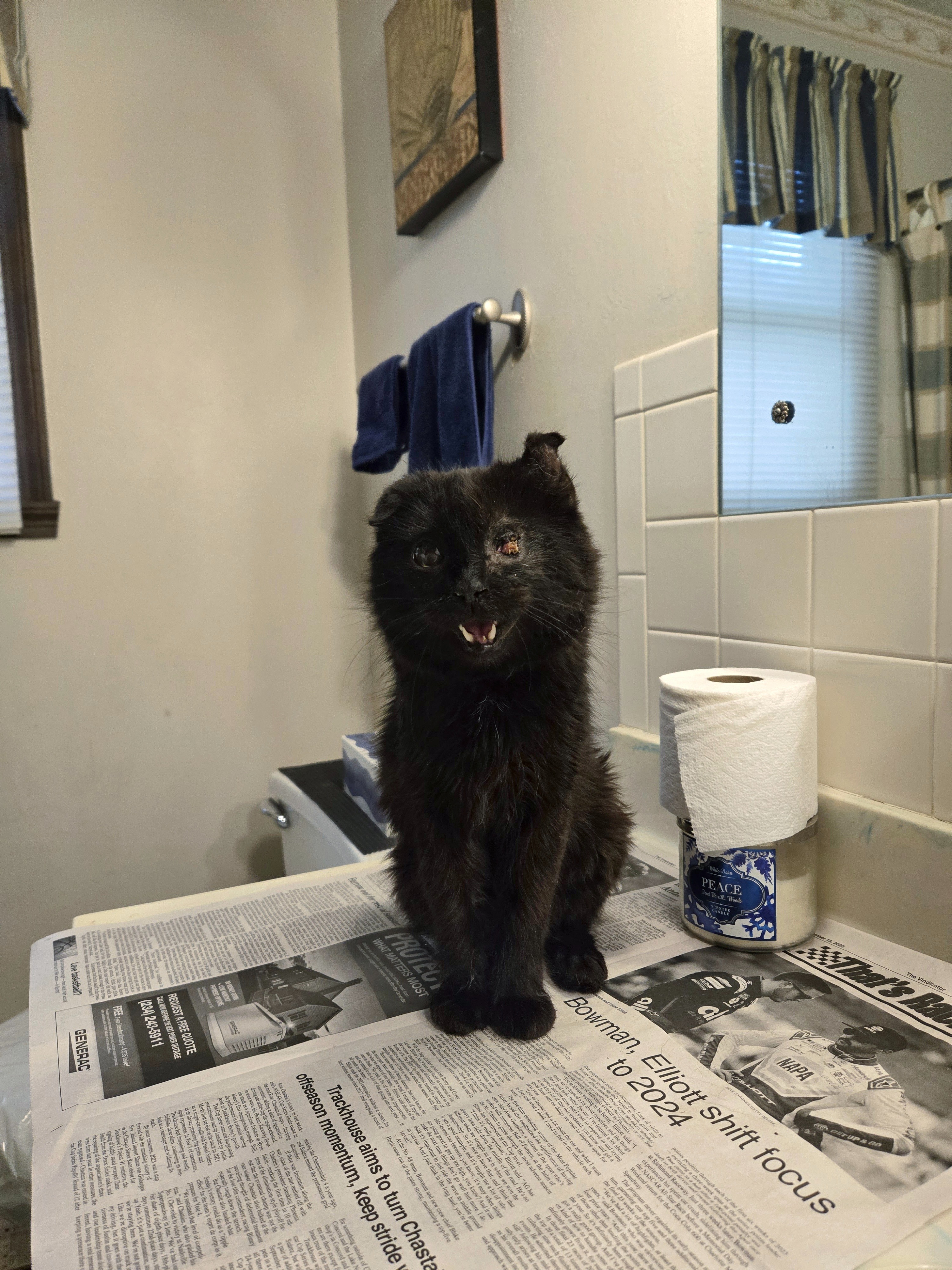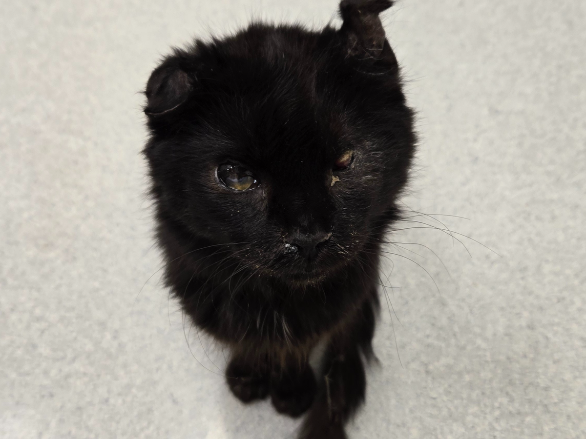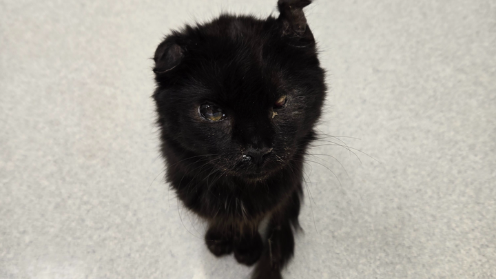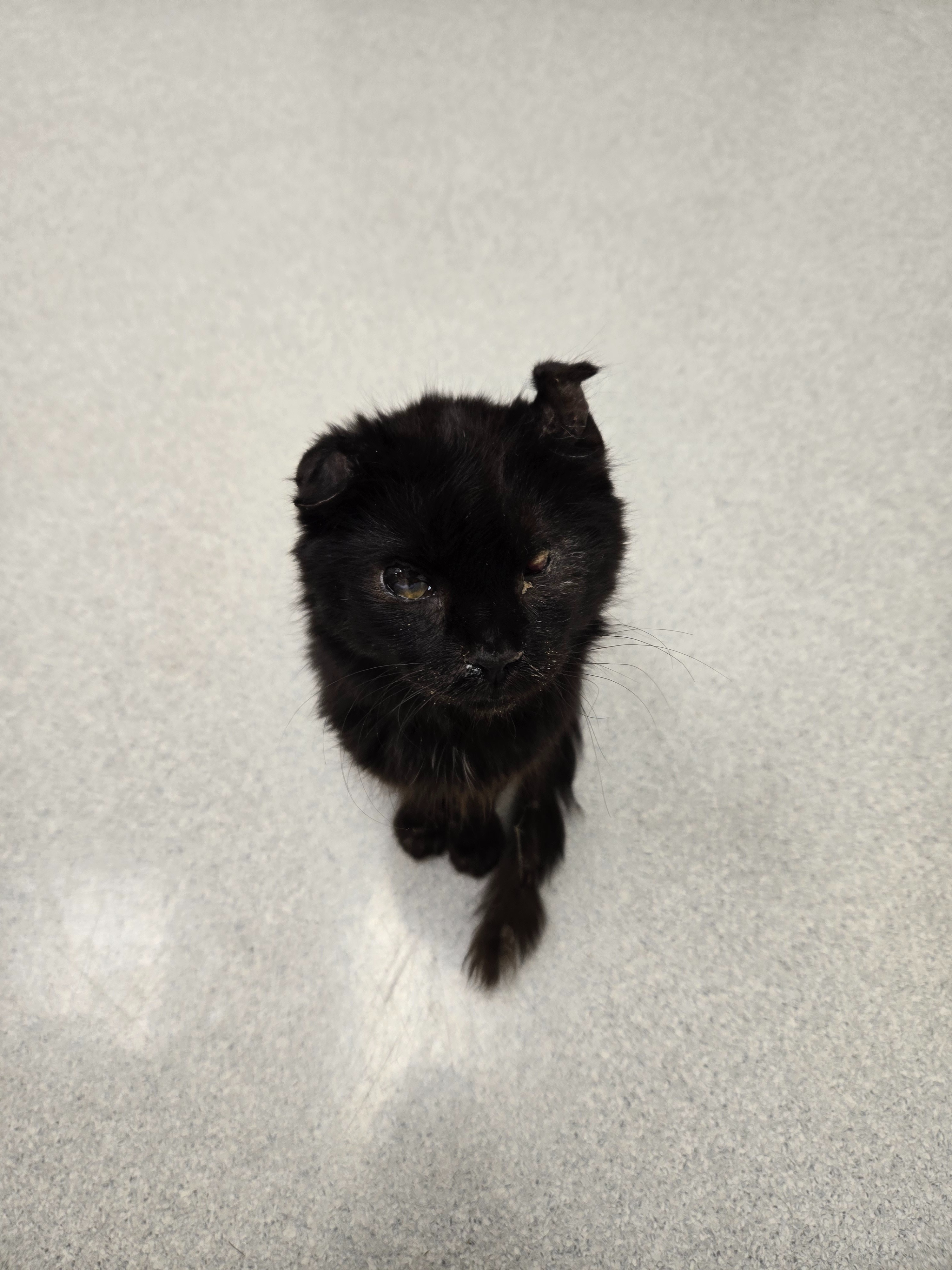 Hi, my name is Nick. I was driving home from work on a country road and I saw a small black animal in the road. I stopped and beeped the horn, but it wouldn't move. I got out of my truck, and this kitten started walking towards me, meowing. He was a mess. One eye was definitely missing or not all there. He was sneezing and had folded ears.