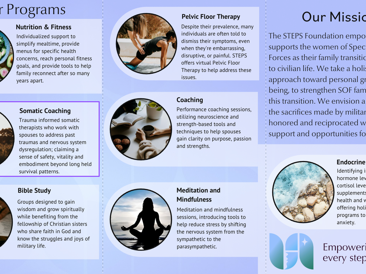 Hi, I’m Angela DeJarnette, and I’m reaching out to you to support The STEPS Foundation, an incredible organization dedicated to empowering female veterans, Gold Star spouses, and SOF spouses. Their mission is to provide trauma-informed resources that foster wellness, career transition, and community connection as they navigate their new lives away from military service.
