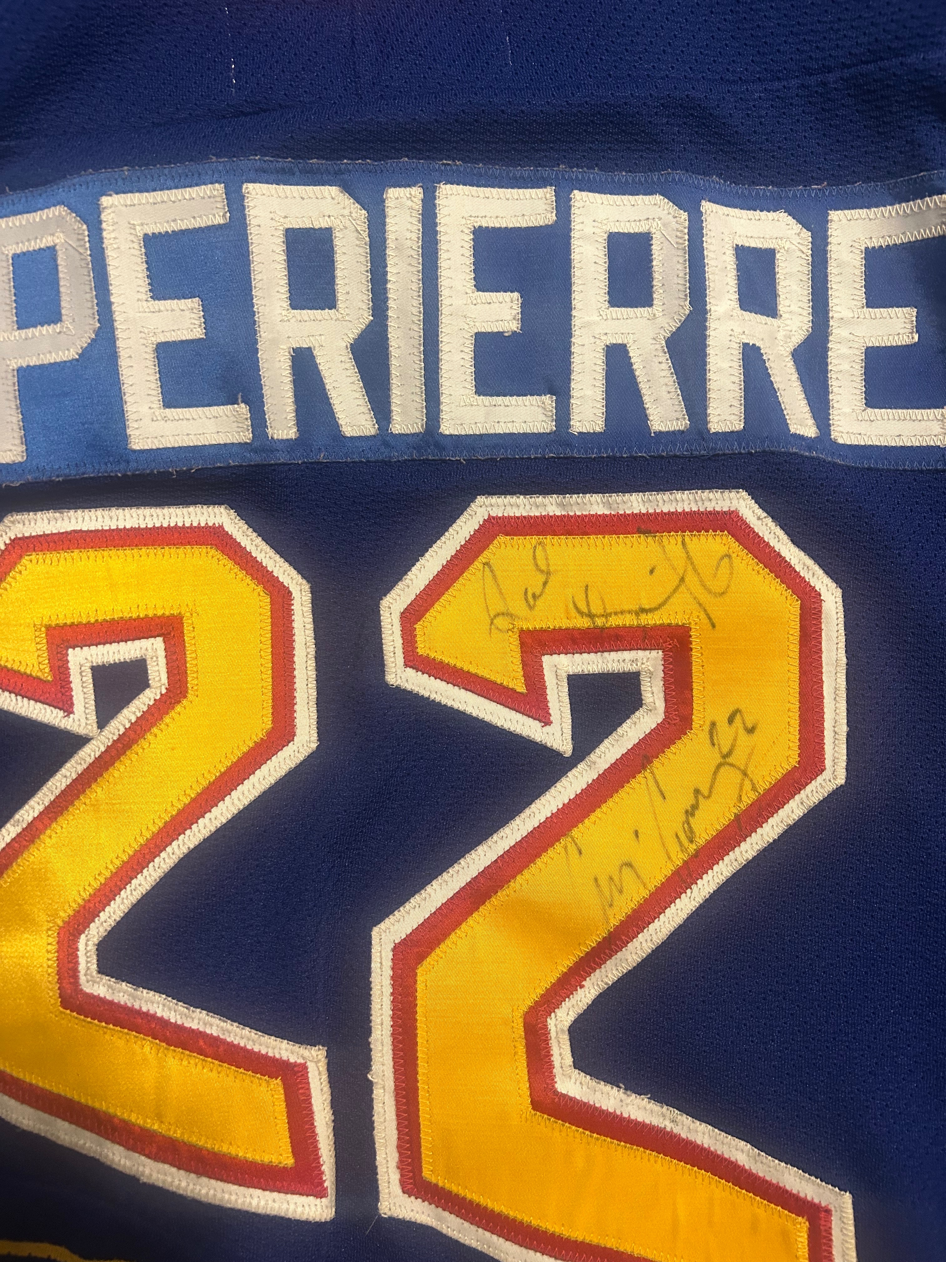 Before pregame warmups we went down to ice level. Joel Quenneville the Blues coach at the time gave us his time and talked to us for several minutes. I have zero recollection of what was said, but it was so cool. He signed my jersey. Just talking to an NHL coach and getting my jersey signed, how could this get any better? We stayed at ice level for pregame warmups. At this point I was too old to be the cute kid and too young to know any better. I was a dipshit kid seizing a moment. As each player left the ice, I had a comment or asked for an autograph. I got one, Craig Conroy, number 22 at the time, signed my number 22 Ian Laperriere jersey. Most of the other players walked past. I want to say a couple nodded, there may have been a high five or two. One of the last players off the ice was Kelly Chase. As he walked off, he flipped me that non-descript puck. I have had that puck for almost 30 years, it is in my will, it matters. I remember almost nothing of the game, I know the Blues lost, I think Grant Fuhr started, and for some reason 5-2 rings a bell, but that night, that night was special.