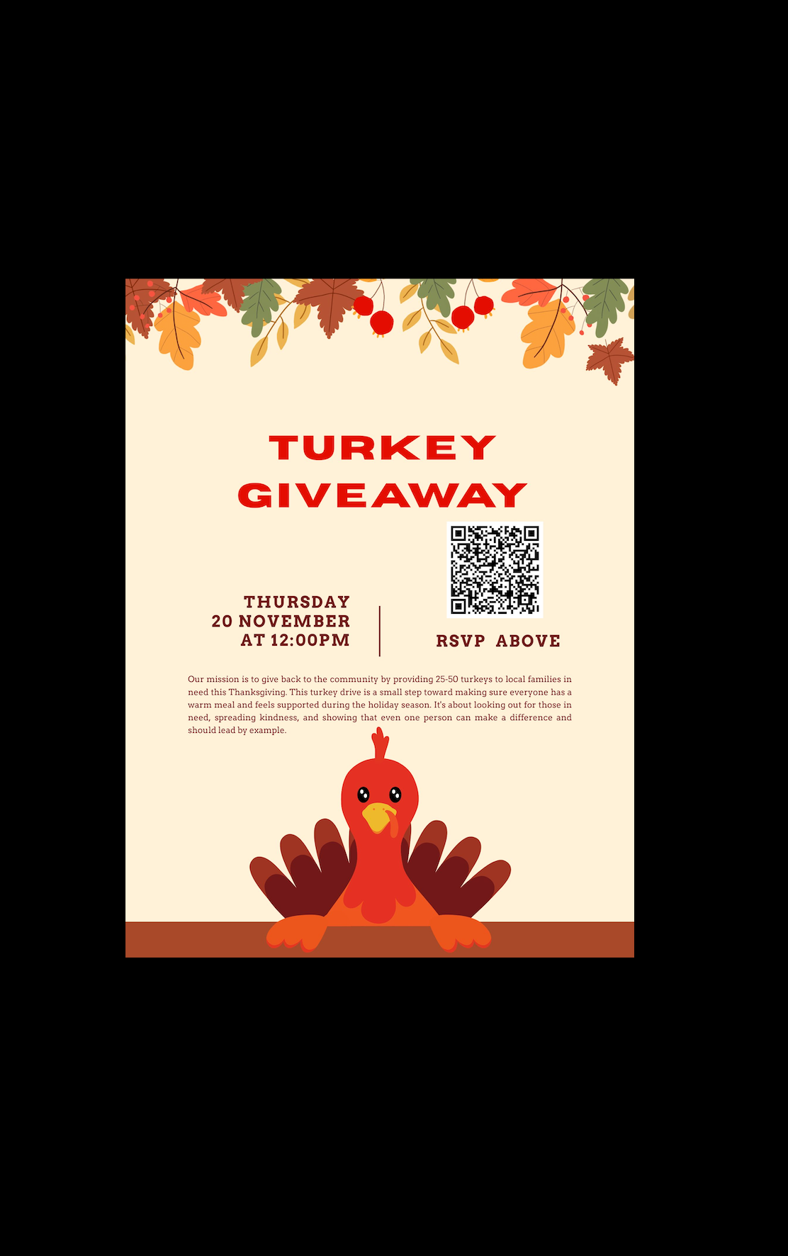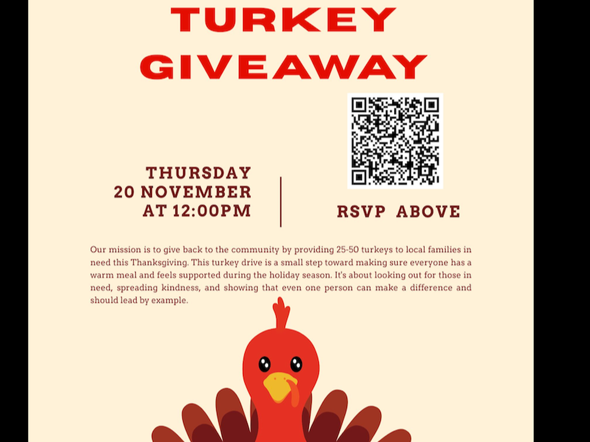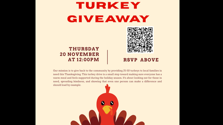 Our mission is to give back to the community by providing 25-50 turkeys to local families in need this Thanksgiving. This turkey drive is a small step toward making sure everyone has a warm meal and feels supported during the holiday season. It's about looking out for those in need, spreading kindness, and showing that even one person can make a difference and should lead by example.