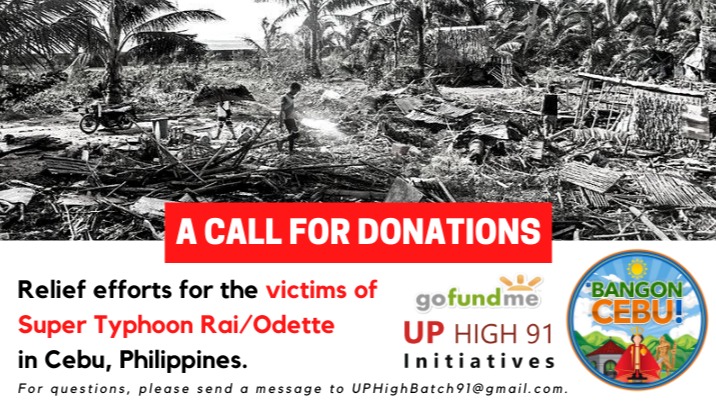 I am deeply grateful and thankful for any amount you can spare. While this fundraiser is a personal project, I will be endorsing your donations to the UP High 91 Initiatives Group located in Cebu, Philippines. I invite you to visit our group's Facebook Page: https://www.facebook.com/UPHigh91