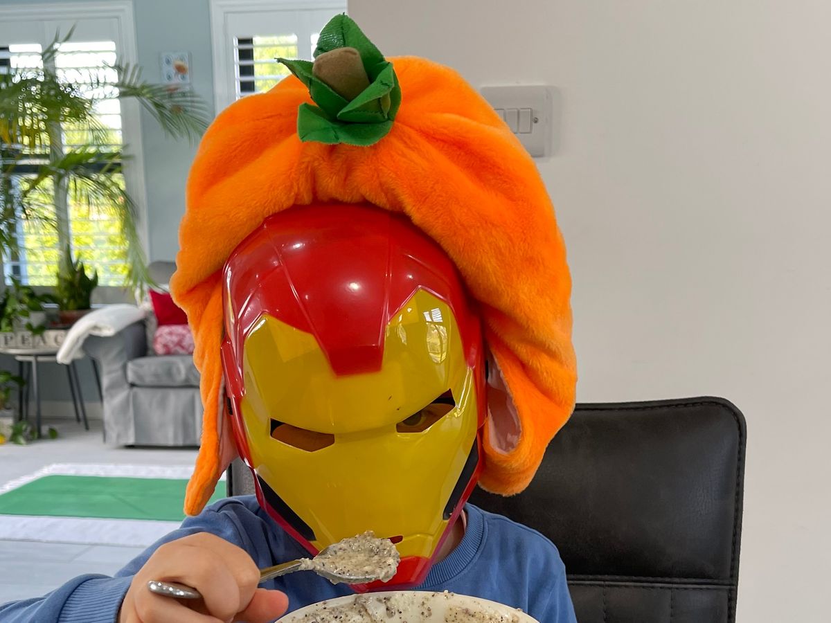 This is Reuben. He is 8 and has Down Syndrome. He LOVES to have the craic as you can see from this photo, where he is trying to eat his porridge thru his Halloween mask :)