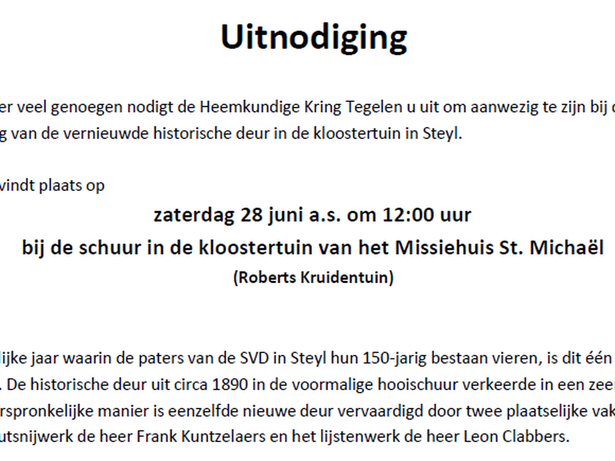 Met bijzonder veel genoegen nodigt de Heemkundige Kring Tegelen u uit om aanwezig te zijn bij de opening en onthulling van de vernieuwde historische deur in de kloostertuin in Steyl.