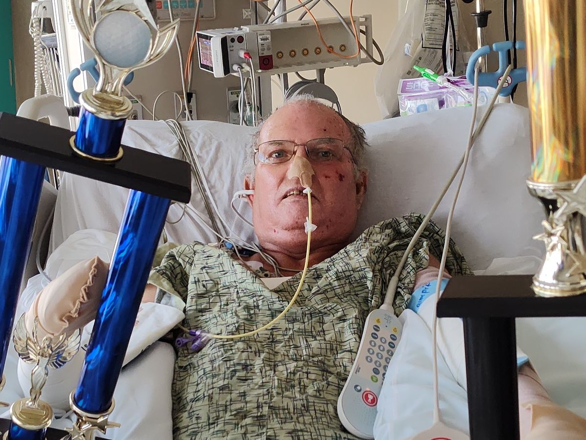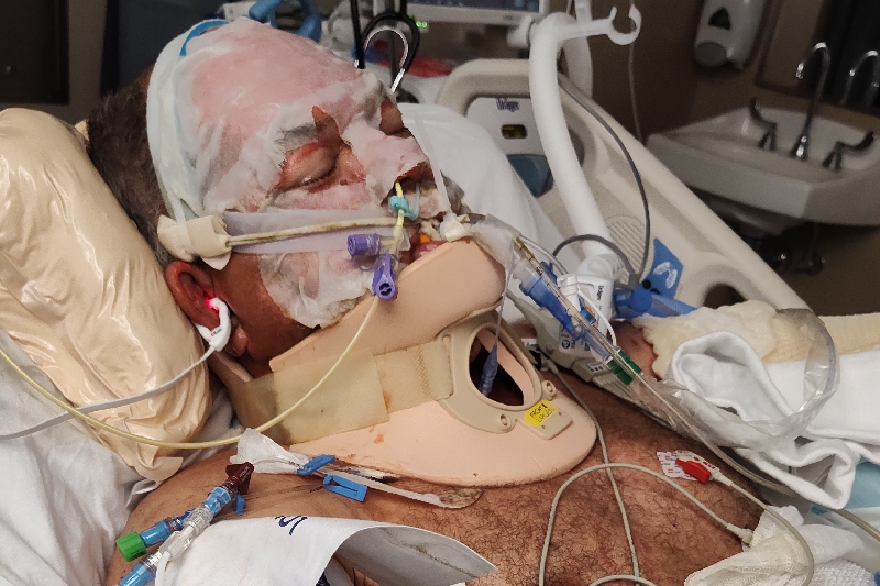 at KU hospital. He has 3rd and 4th degree burns on 65% of his body. Due to the