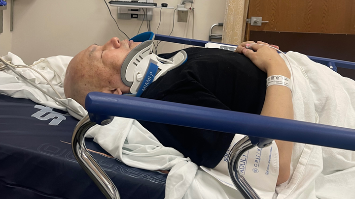 He is in significant pain and is mostly confined to bed. His recovery will take time, ongoing medical care, and patience.