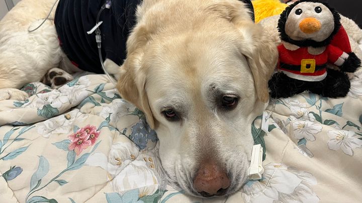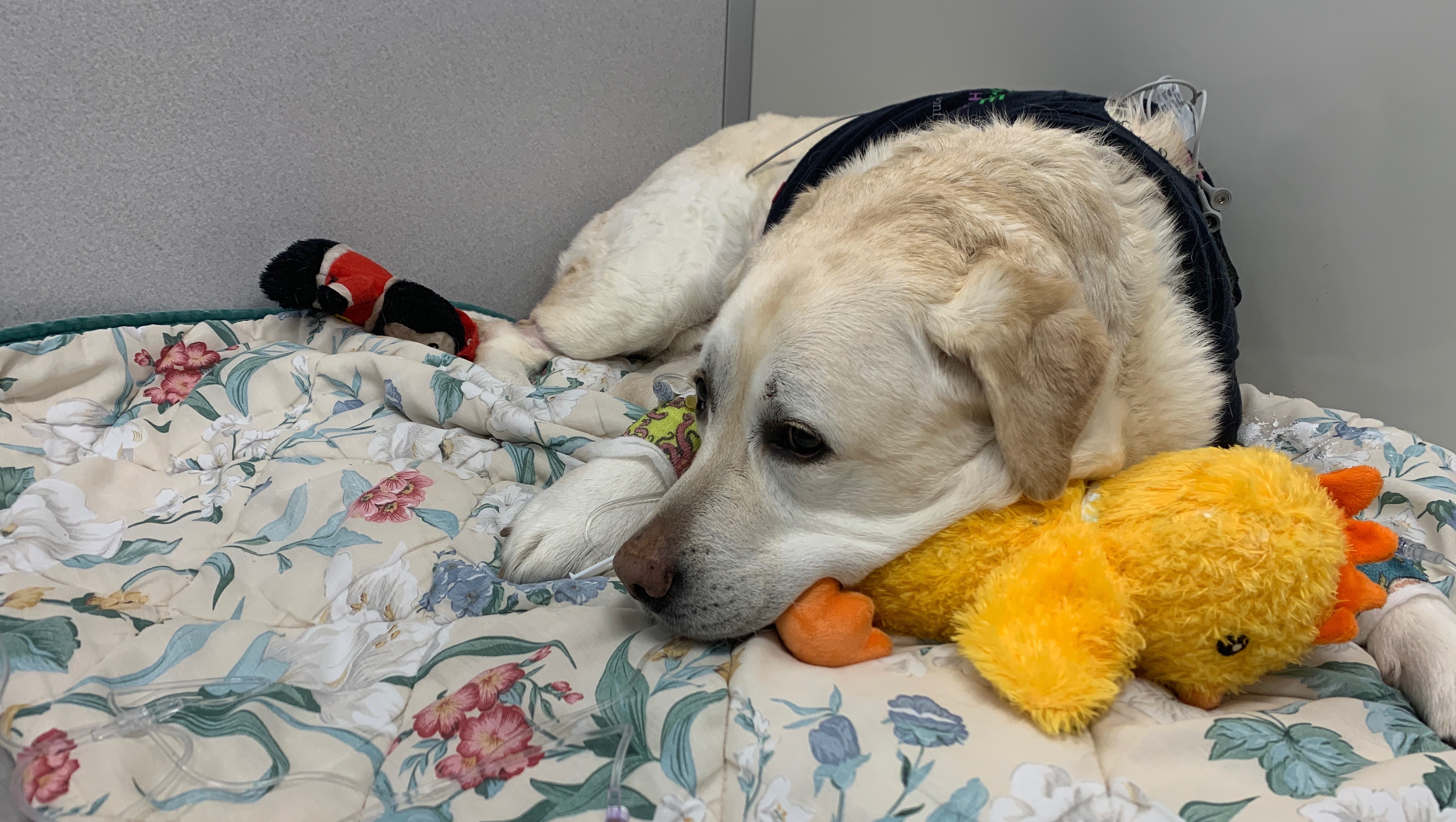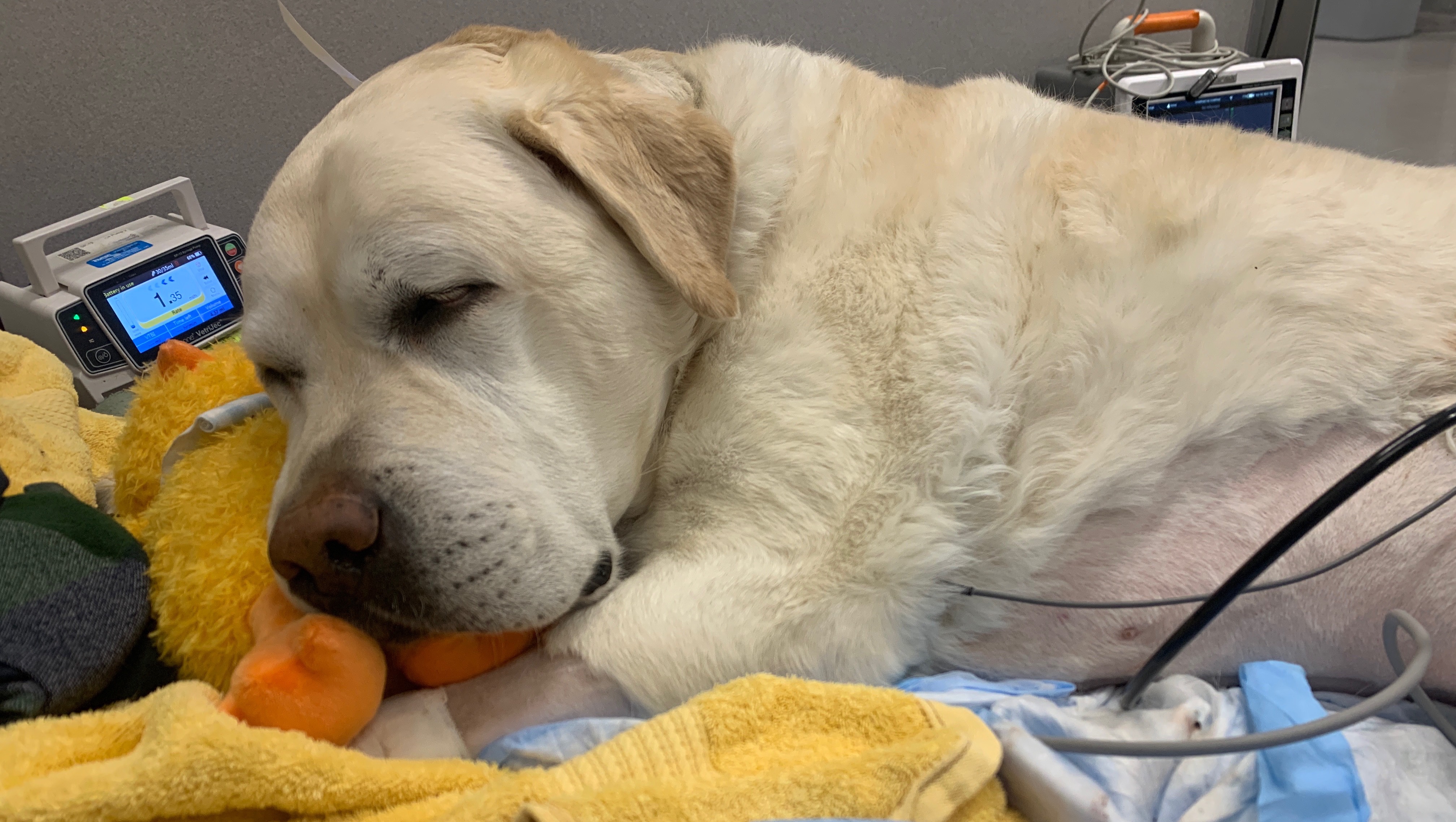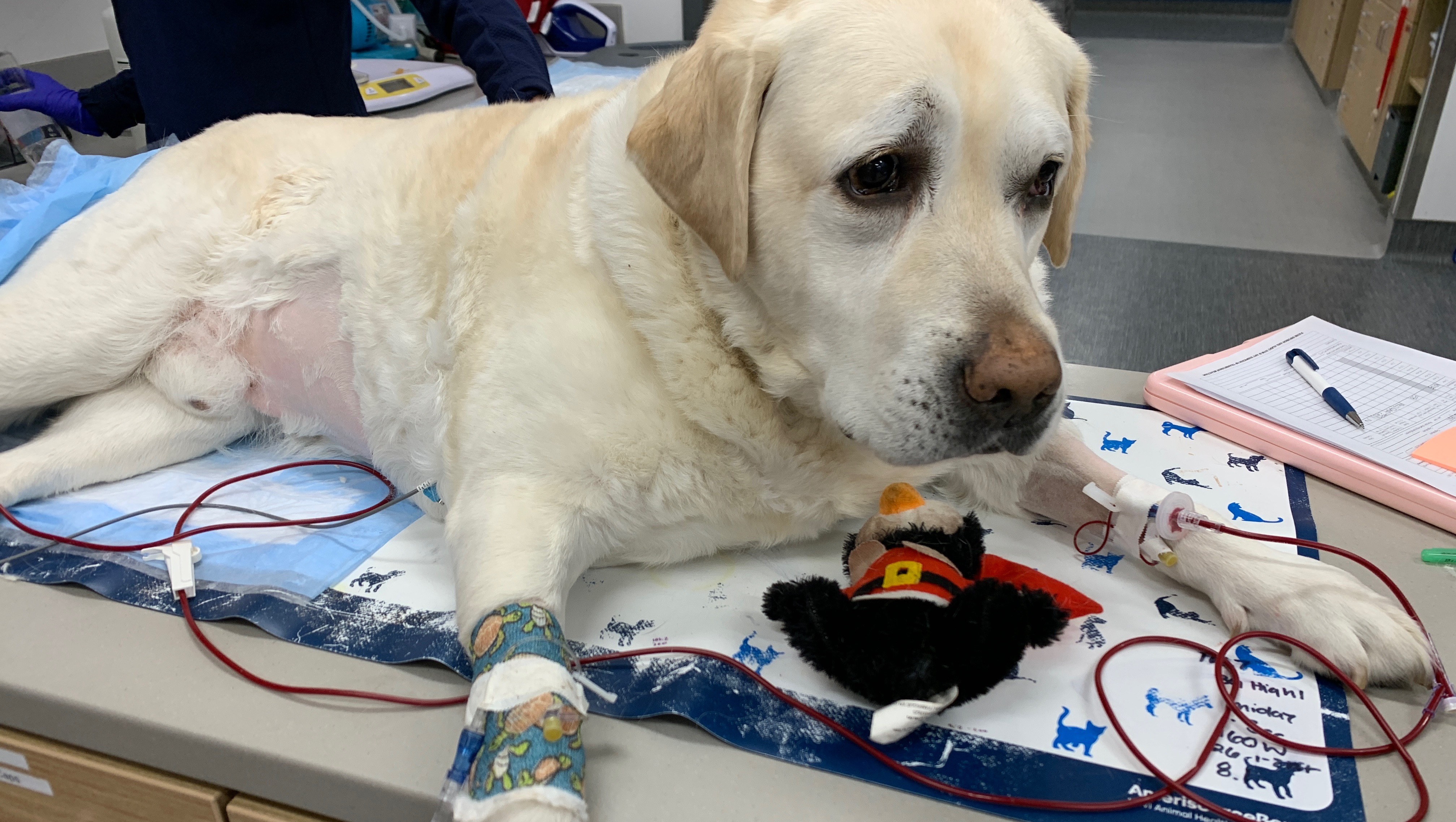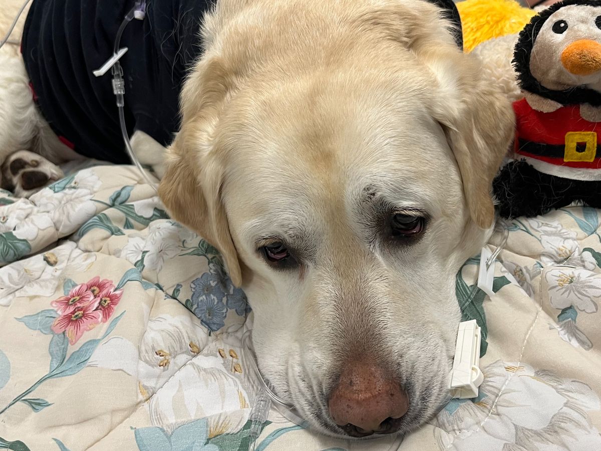 George presented to Partner Veterinary Emergency and Specialty Center on the evening of 3/3 for acute lethargy, pale gums, and bloody vomit and diarrhea. His case quickly took a turn for the worse as he became profoundly anemic, minimally responsive, and required an urgent blood and plasma transfusions. As a result of his severe illness he has developed complications with an abnormal heart rhythm and continued gastrointestinal problems secondary to this bleed. Thankfully he seems to have stabilized with treatment and his diagnostics did not reveal any surgical or cancerous cause for his gastrointestinal bleeding.