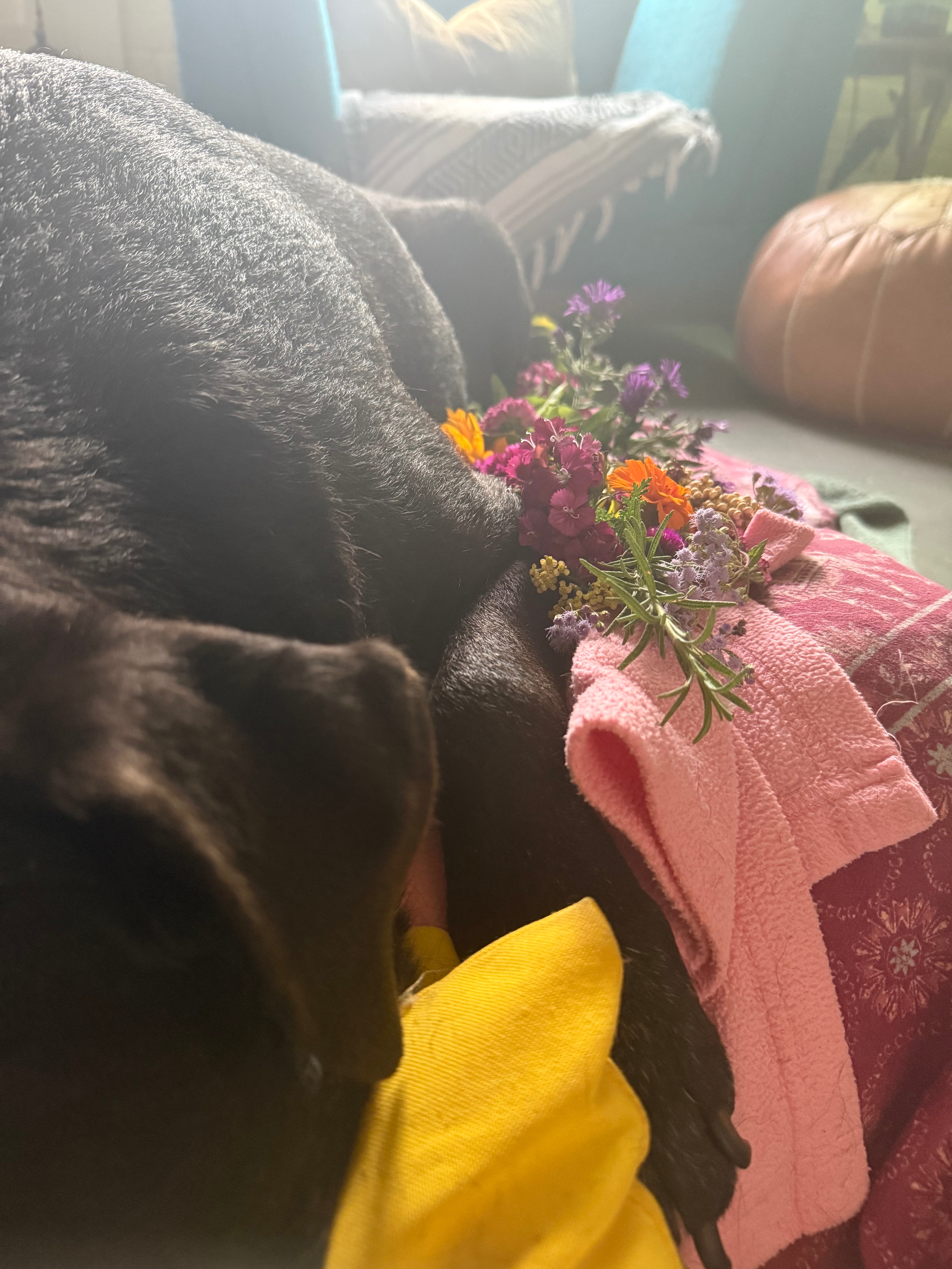 The day before my birthday, my beloved soul dog, Nico, started showing worrisome symptoms. A lengthy visit to the ER along with multiple tests showed possible liver failure, but additional and extensive tests were needed to confirm. By the morning of the 22nd, she woke up showing further decline. Rushing to the ER, she spent the full day being put through testing, scans, and blood work to identify the cause. It took a lot of effort on behalf of the staff that treated her, there were a lot of factors that made it hard to identify the root issue. Her gallbladder needed to come out, and she was experiencing liver failure. Considering the risk and need of first needing to get her stabilized for gallbladder surgery, the doctors expected a 7-day hospitalization for the full procedure, upwards of $10,000 in fees or more. With 14 years on this planet and 13 of them with me, I knew what had to be done. Nico hated the vet and those bright lights. She was a soft and warm aesthetic kind of girl. I brought her home and was able to make arrangements for her transition. We laid her to rest, in her home, on her favorite dog bed, surrounded by a bounty of flowers and herbs. Some flowers were gifted by loved ones for what we thought was my birthday, but ended up being unintentional ceremonial adornment. Herbs such as rosemary, yarrow, lavender, and tulsi from the yard. Wrapped in remembrance, love and protection, comfort, and soul cleanse.