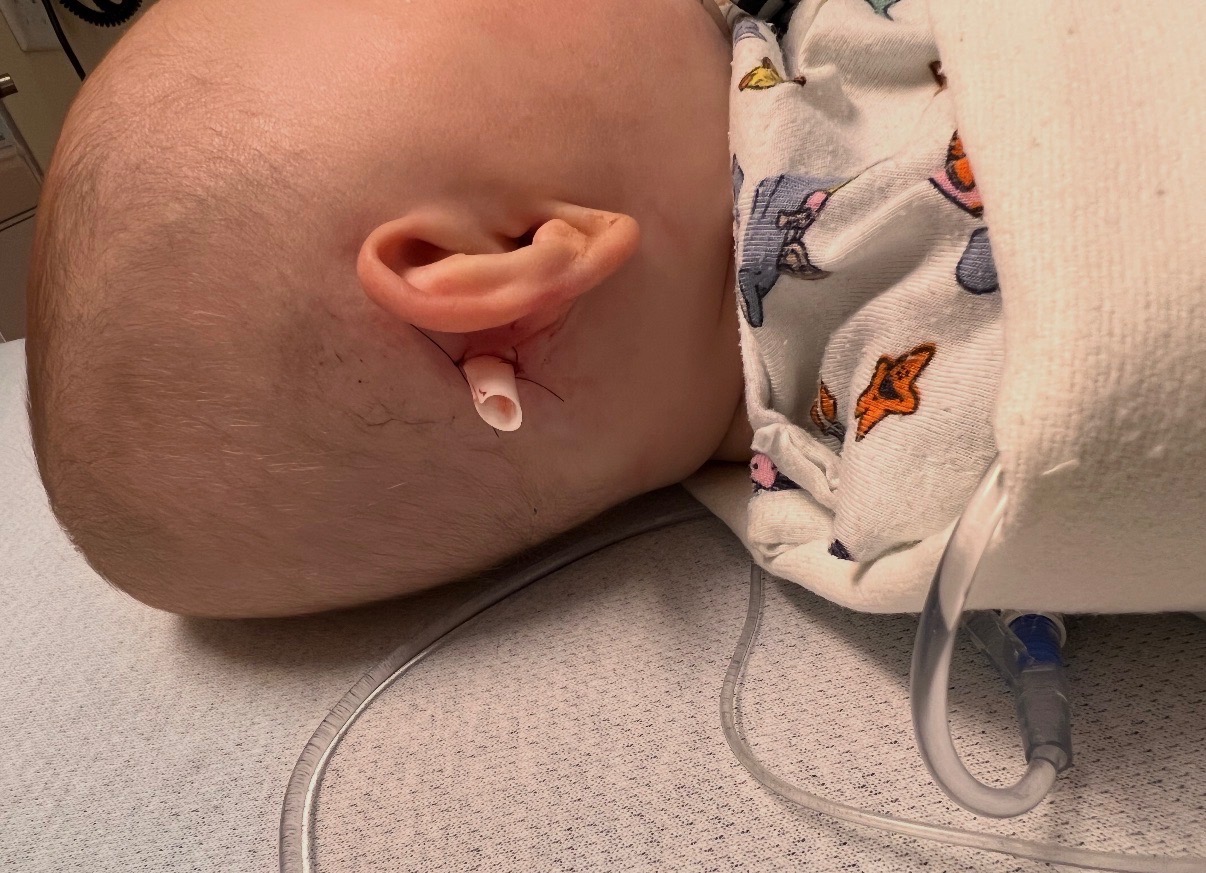 Easton had an ear infection that went completely unnoticed. It had spread to the bone and began to eat away at it, coming dangerously close to reaching his brain. He was admitted Friday morning and underwent emergency surgery to drain 5 mL of infected fluid.