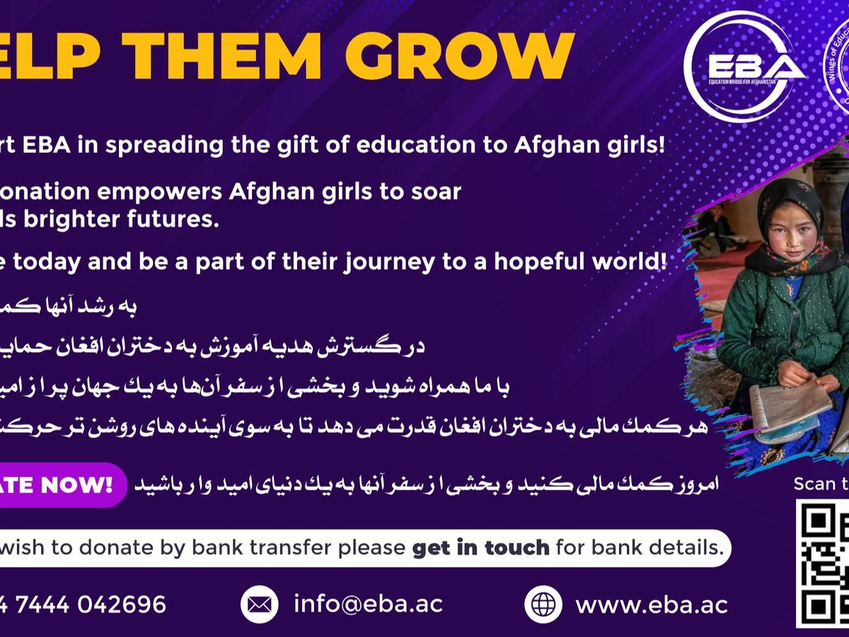 Education Bridge for Afghanistan (EBA) helps individuals and organisations provide education/training using virtual platforms for Afghan girls. EBA is raising funds for this purpose to allow every Afghan girl her fundamental right to education and to empower her to develop her skills and live an independent life by seeking employment in Afghanistan or other countries after the completion of her education.