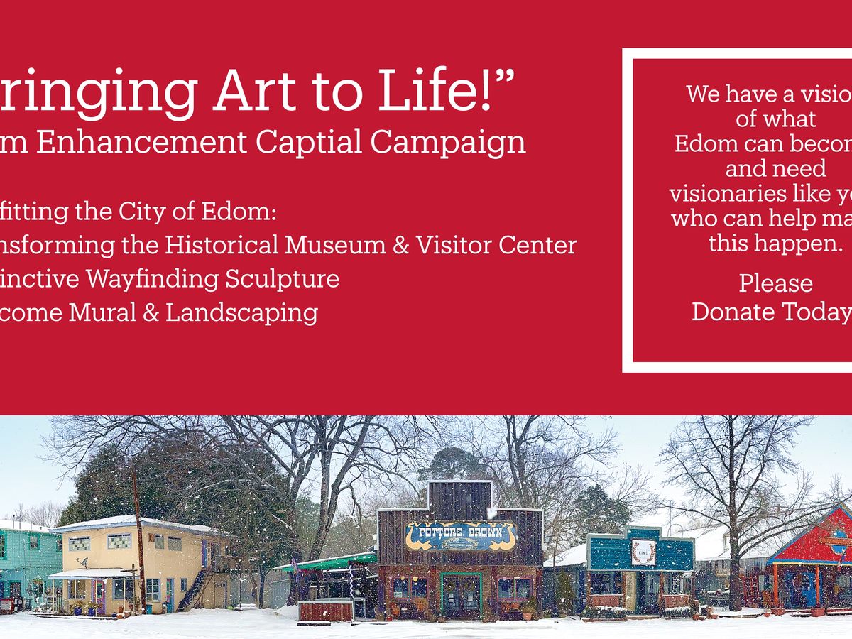 In an effort to bring more visitors to Edom, The Edom Area Chamber of Commerce, The Edom Historical Museum, The Edom Craft Community & the City of Edom have come together to create The Edom Enhancement Capital Fund Raising Campaign with the goal of creating 4 Public Projects