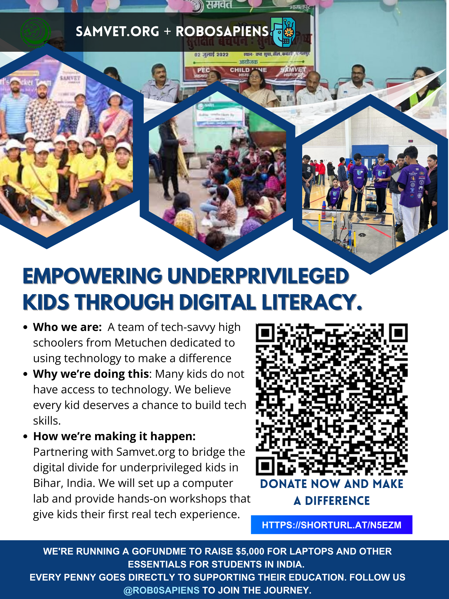We're a team of tech-savvy high schoolers from Metuchen, NJ, collaborating with Samvet.org to bring digital literacy to underprivileged children in Bihar, India. Our group, RoboSapiens, is passionate about using technology to make a real difference.