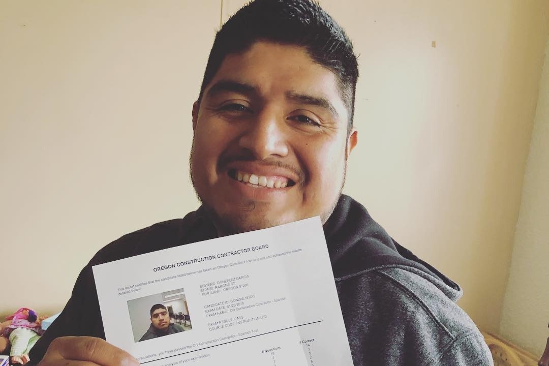 Edward proudly holding up his certificate for a contractor's license that he worked so hard for