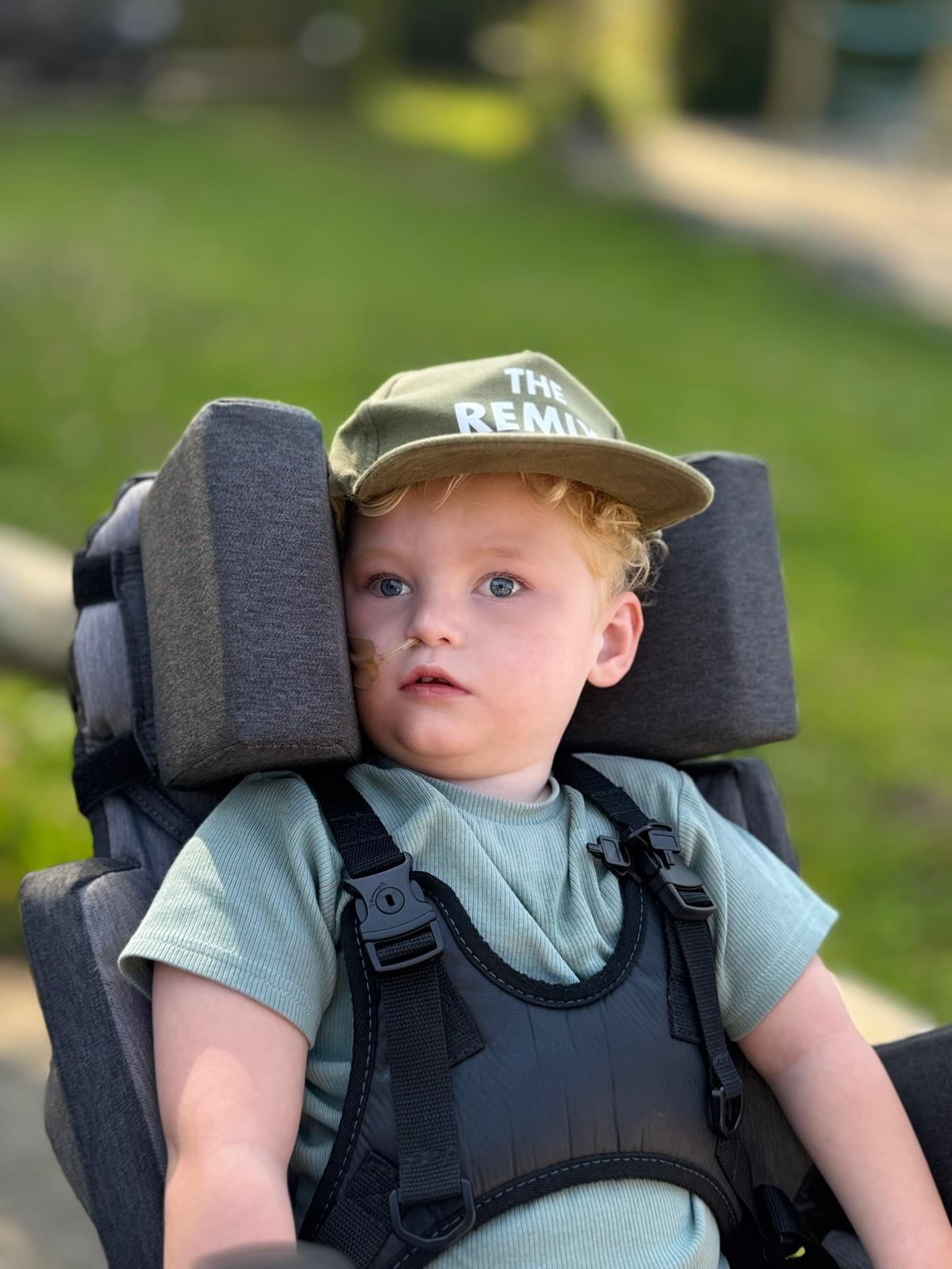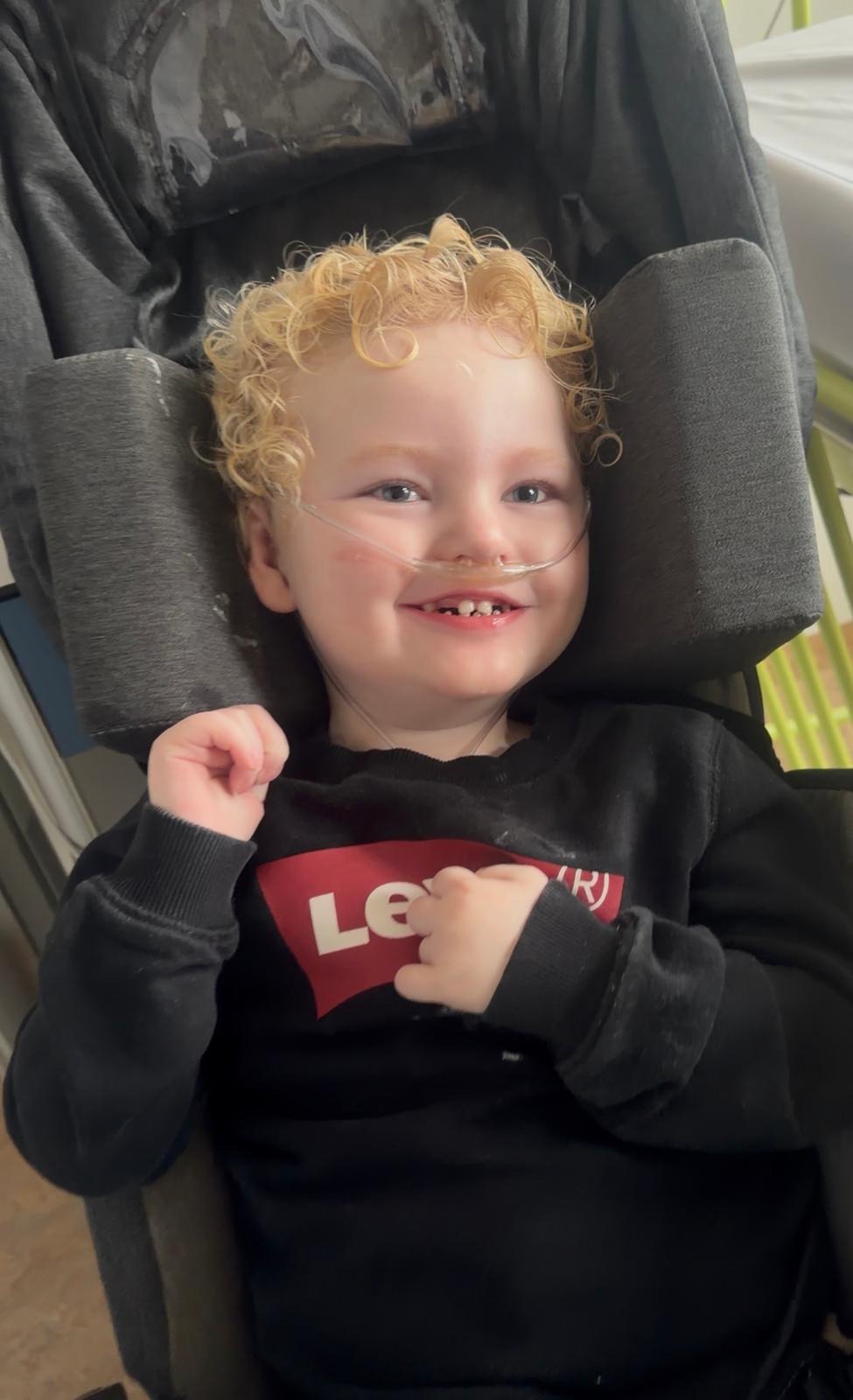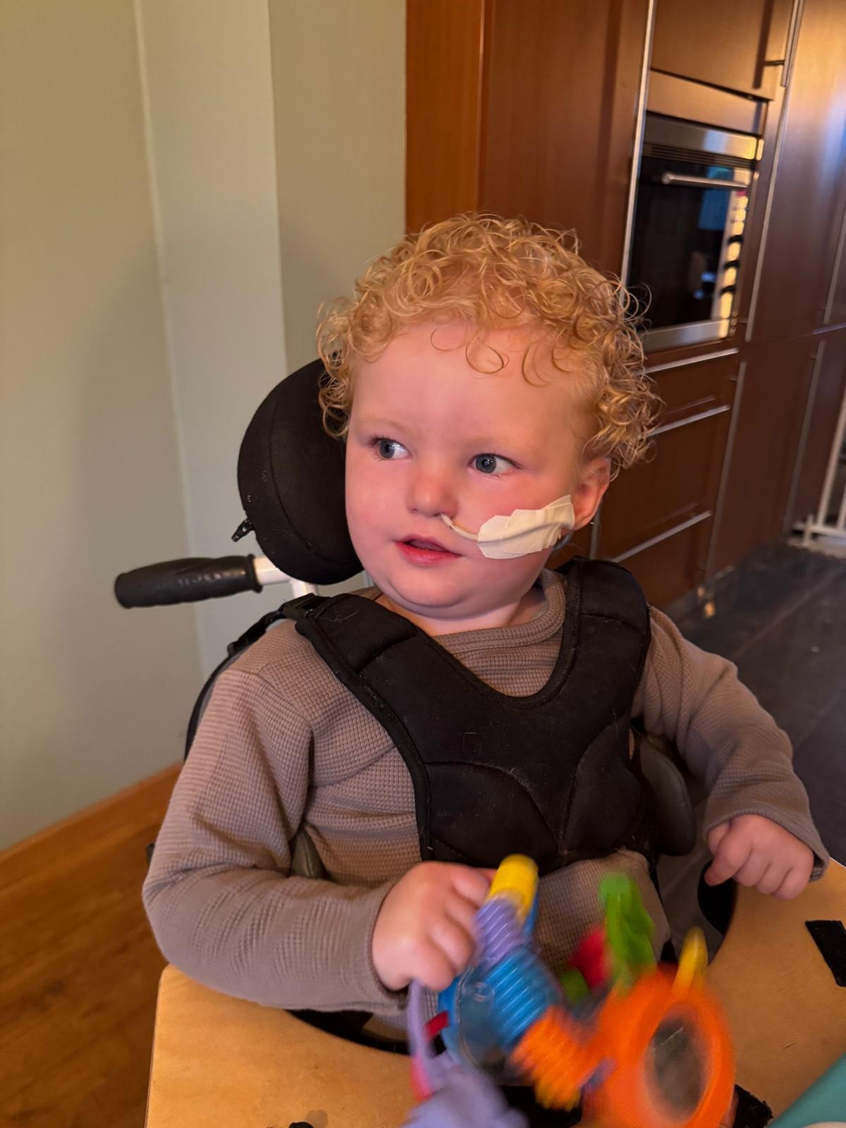 Hij kan zijn eigen hoofdje niet zelf dragen vanwege lage spierspanning en zijn ontwikkelingsachterstand. Daarom zit hij in een speciaal aangepaste stoel die zijn hoofd, nek en romp volledig ondersteunt.