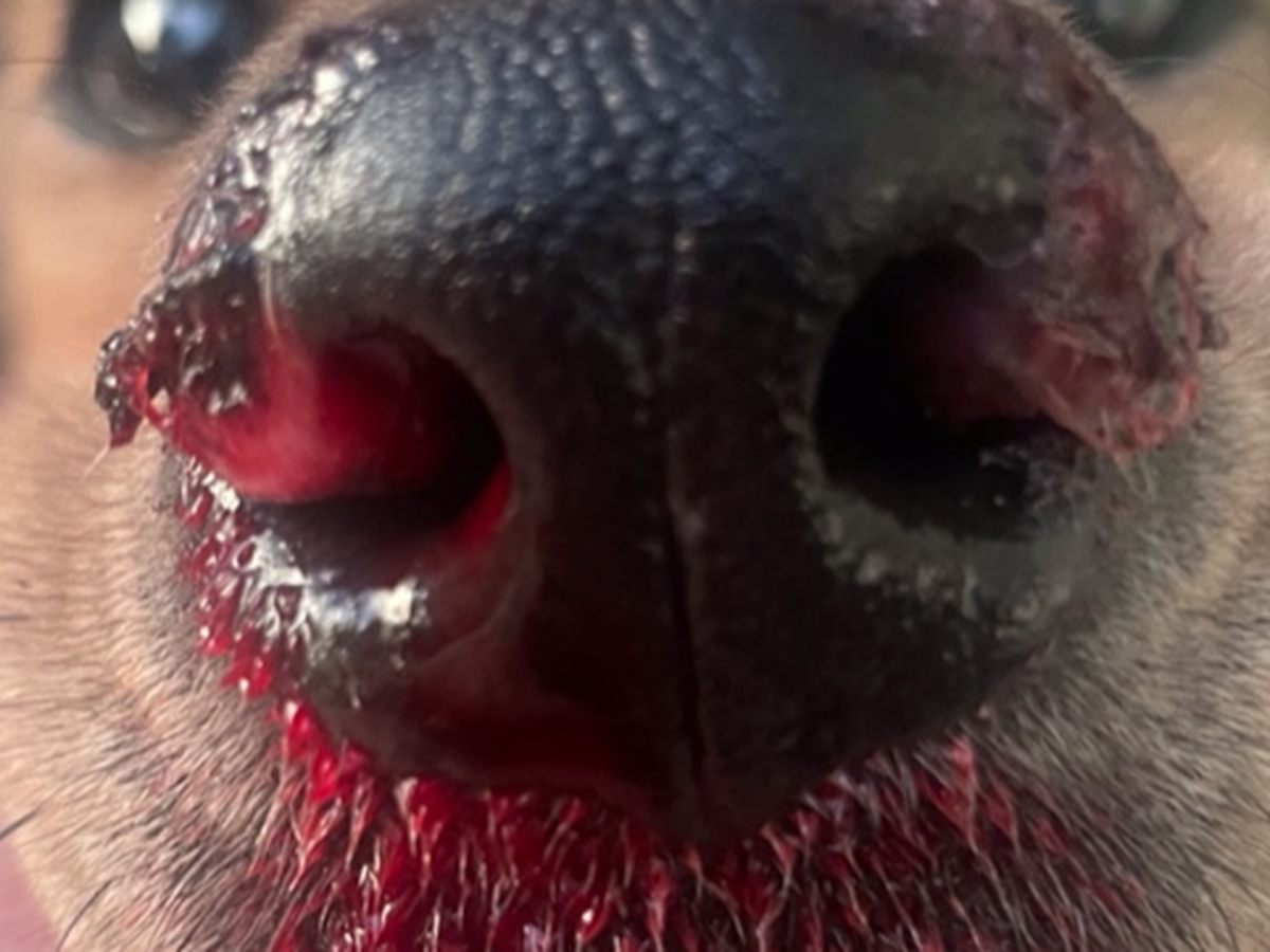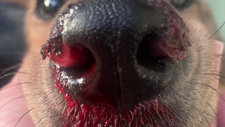 This story is about my grand-dog. Her name is Dolly and my name is Eileen, or Baca as all my grandkids and grand-dogs know me. Dolly is so appropriately named because she is truly a doll! She is a rescue dog who was saved from a hoarding situation and quickly captured our hearts and became part of our family in 2021. A genetic study showed that Dolly was a mixture of around 13 breeds, and probably some incest occurred due to the hoarding environment. Dolly seemed to develop normally, but at around 2 years old, she began to bleed from her nostrils. At first, we would just wipe it away, but then her nose began to crust up, and the bleeding episodes became more frequent and were harder to stop. She would appear distressed as she would lick her nose and sometimes seemed like she was struggling to breathe and then would vomit the blood up. These episodes are exhausting and terrifying for both Dolly and the family. We took her to our family vet, and they ran a series of tests, but the vet really couldn't give us a firm diagnosis and suggested we visit the CSU Veterinary Teaching Hospital. There, they ran a series of tests as well and were able to give us some idea of the things it could be. In order to make a firm diagnosis, some more testing needs to be done.