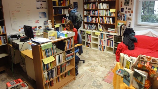 2016 mussten wir aufgrund des Umbaus der Hauptbibliothek unseren Standort aufgeben und siedelten ins Quartier Leech der Katholischen Hochschulgemeinschaft, wo wir (und unsere Bücher) bis Dezember 2025 ein Zuhause fanden.