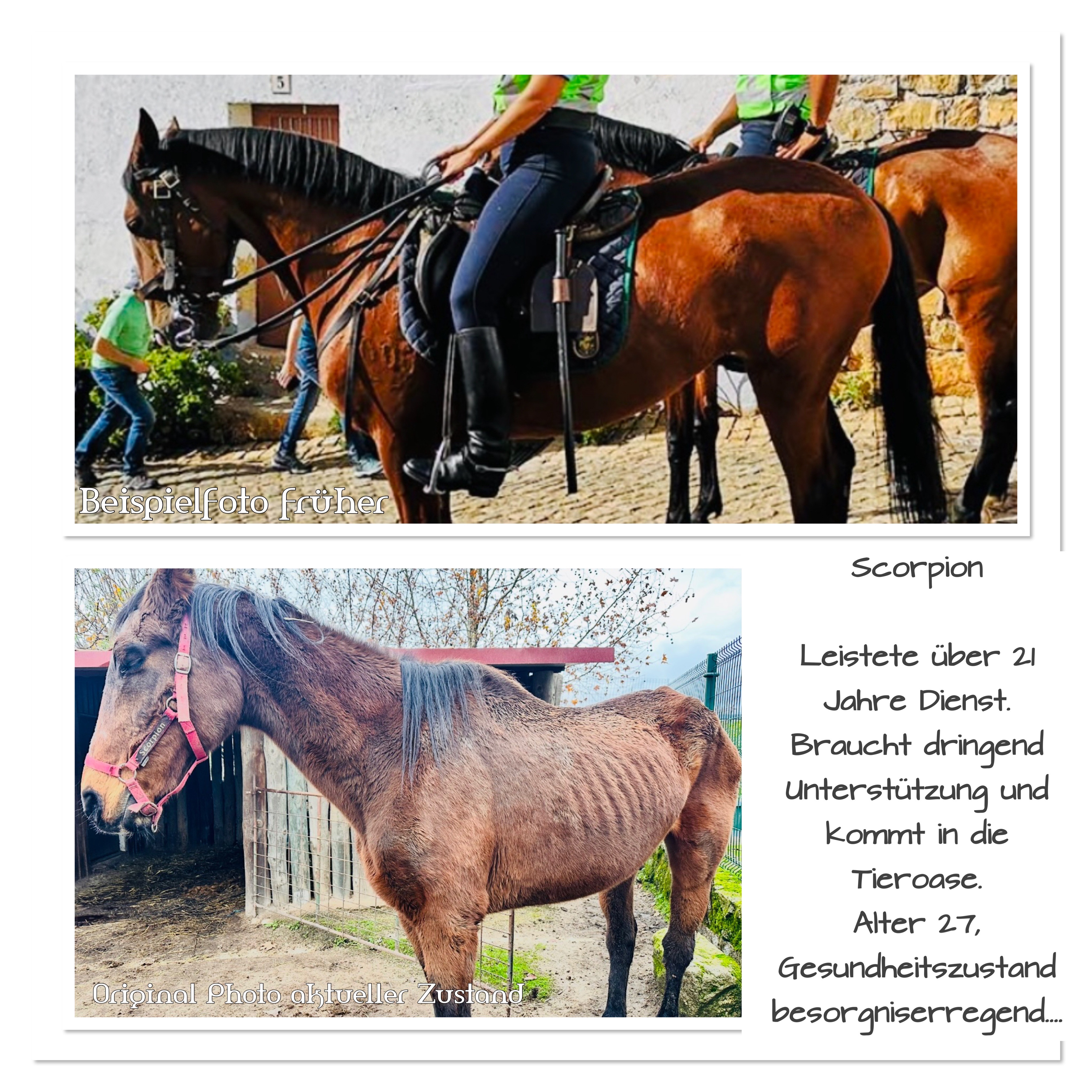 ein 27-jähriges ehemaliges Dienstpferd, stark abgemagert, das dringend Ruhe, Pflege und Zeit zum Aufbauen braucht