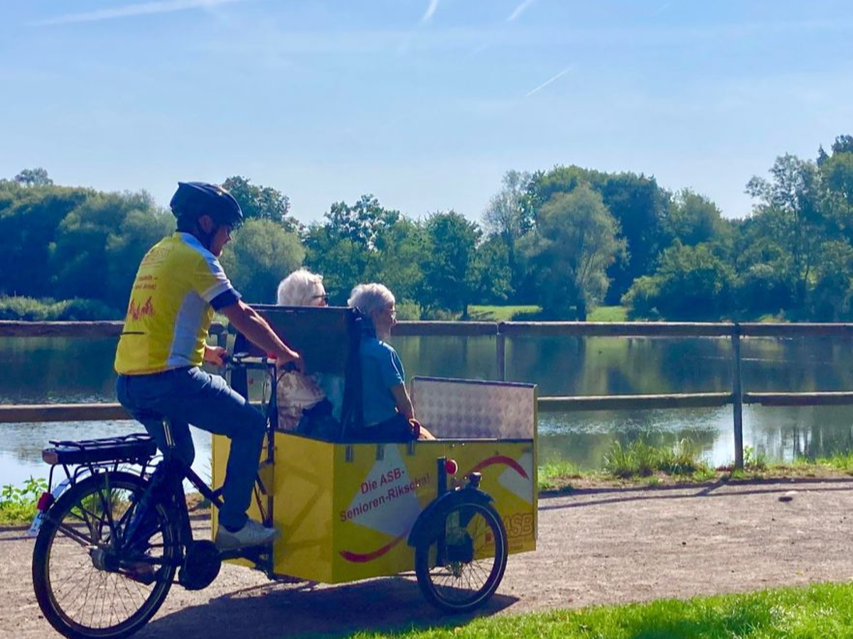 Für den Umbau der Rohlinge wurde der Lastenrad-Spezialist „Fulmo“ in Leipzig angesprochen. Dort passen Tilman Keding und sein Team die Rikscha auf die Bedürfnisse älterer Menschen an. Das Besondere an der Idee des ASB ist die duale Nutzungsmöglichkeit der Rikscha: Durch einen eingebauten Klappsitz können entweder zwei mobile Personen auf der Bank Platz nehmen oder ein Rollstuhlfahrer samt Rollstuhl befördert werden. Alle Passagiere werden zusätzlich mit Becken- und Schultergurt gesichert, bevor die Fahrt losgeht, erklärt der Maschinenbauingenieur. Eine absenkbare Rampe ermöglicht immobilen Personen die Auffahrt in den Fahrgastbereich. Auch der Rollstuhl wird während der Fahrt an der Rikscha fixiert. Ein weiterer Vorteil: Durch den Transport im eignen Rollstuhl sind die Fahrgäste am Zielort beweglich. Die ASB-Seniorenrikscha verfügt über einen elektrischen Motor, der die Tretleistung der Fahrer unterstützt und den Einsatz auch auf steileren und längeren Wegstrecken zulässt. Die Passagiere sitzen im vorderen Teil der Rikscha, sodass während der Fahrt auch ein Gespräch mit dem Fahrer möglich ist. Für diese Idee gab es 2021 von Sachsens Umweltminister den eku-ZUKUNFTSPREIS für Energie, Klima und Umwelt.