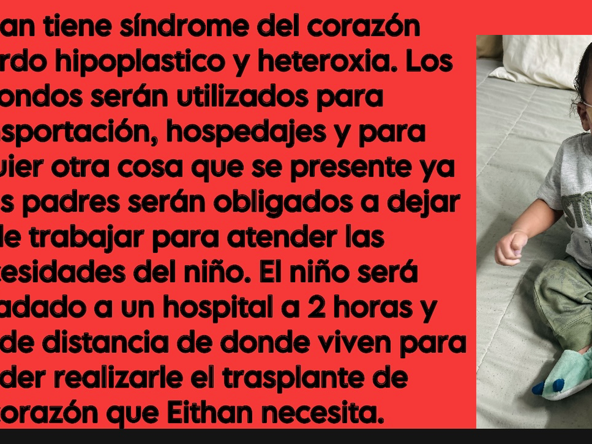 Hola me llamo alondra soy la mamita de eithan. Eithan tiene síndrome del corazón izquierdo hipoplastico y heteroxia. Estamos recaudando fondos debido a que eithan será trasladado a otro hospital a 2 horas y medias de casa. Los fondos serán utilizados para transportación, hospedaje, comida y cualquier otra situación de debido a que mamá y papá tendrán que dejar de trabajar por meses largos .