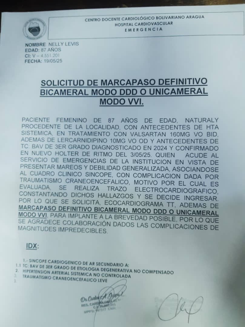 Hoy, su corazón necesita ayuda. Le han diagnosticado un bloqueo auriculoventricular de tercer grado, un trastorno grave que pone en riesgo su vida si no se actúa con rapidez. Su única opción es una cirugía urgente para colocarle un marcapasos definitivo que le permita seguir viviendo con calidad, alegría y seguridad.