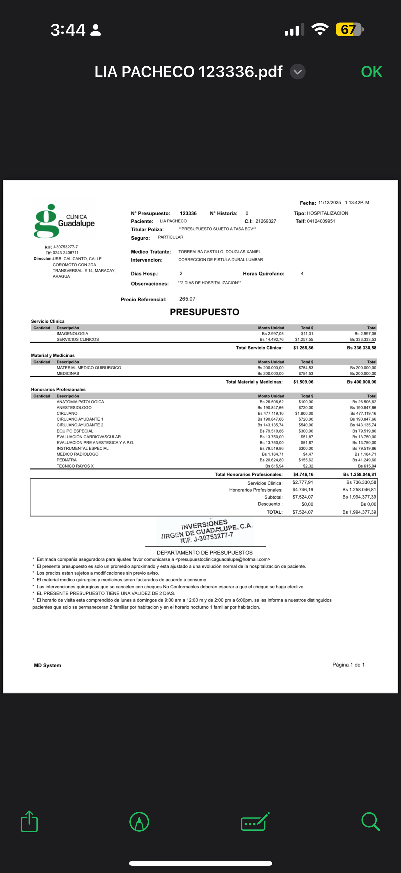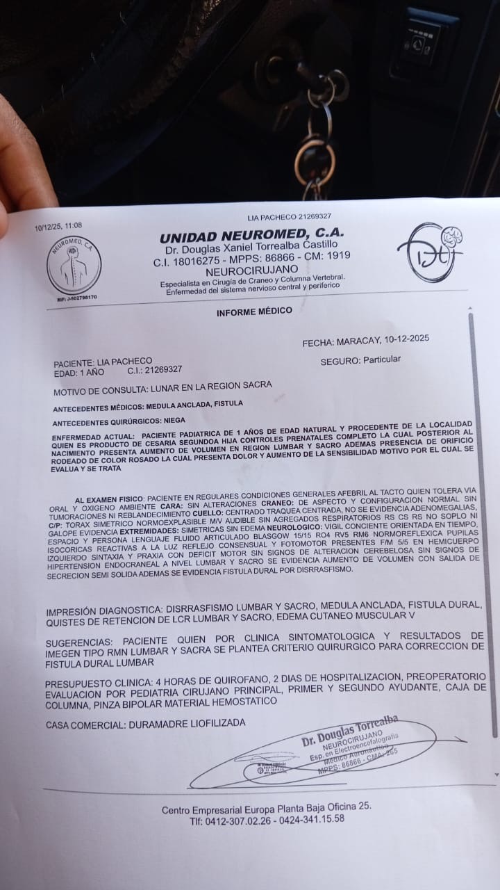 El presente informe médico, emitido por el Neurocirujano Dr. Douglas Xaniel Torrealba Castillo de la Unidad Neuromed, C.A. el 10/12/2025, confirma que la paciente Lia Pacheco, de 1 año de edad, requiere urgentemente una intervención quirúrgica debido a una condición congénita compleja de la columna. El diagnóstico principal incluye Disrafismo Sacro, Médula Anclada y Fístula Dural, una patología que se manifiesta como un aumento de volumen en la región sacra y afecta la sensibilidad motora de sus extremidades inferiores. La corrección de esta condición es vital y el procedimiento presupuestado incluye 4 horas de quirófano, 2 días de hospitalización, la evaluación preoperatoria por pediatría, el pago de cirujanos principal y dos ayudantes, y el suministro de materiales específicos como la Duramadre Liofilizada, Caja de Columna, pinza bipolar y material hemostático, siendo la finalidad de la cirugía la corrección definitiva de la fístula dural y la liberación de la médula anclada para evitar el progreso de daños neurológicos permanentes.