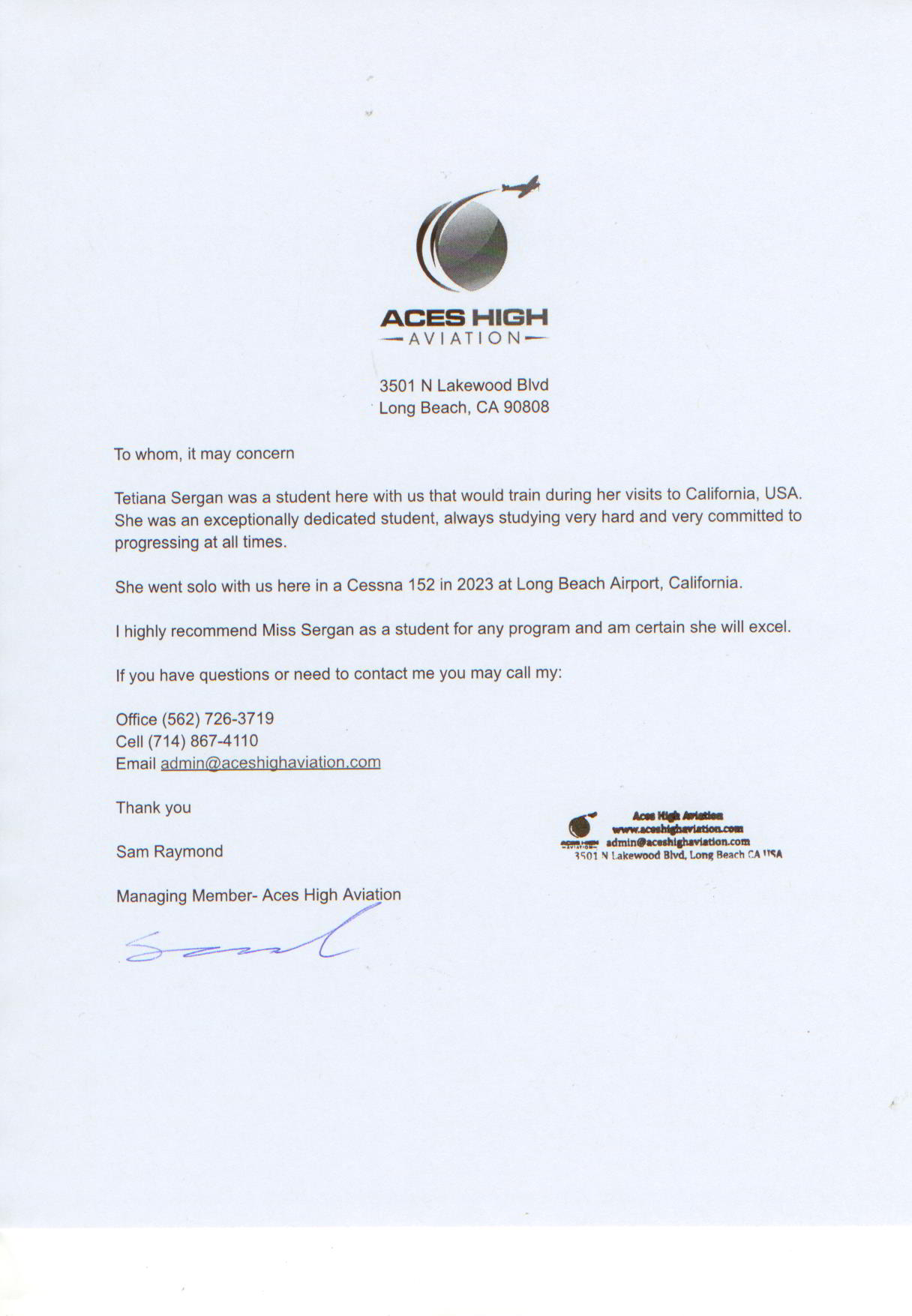 In my opinion, Tetiana has the necessary qualities required to complete the flight training and thereafter have a successful career as an airline pilot.”