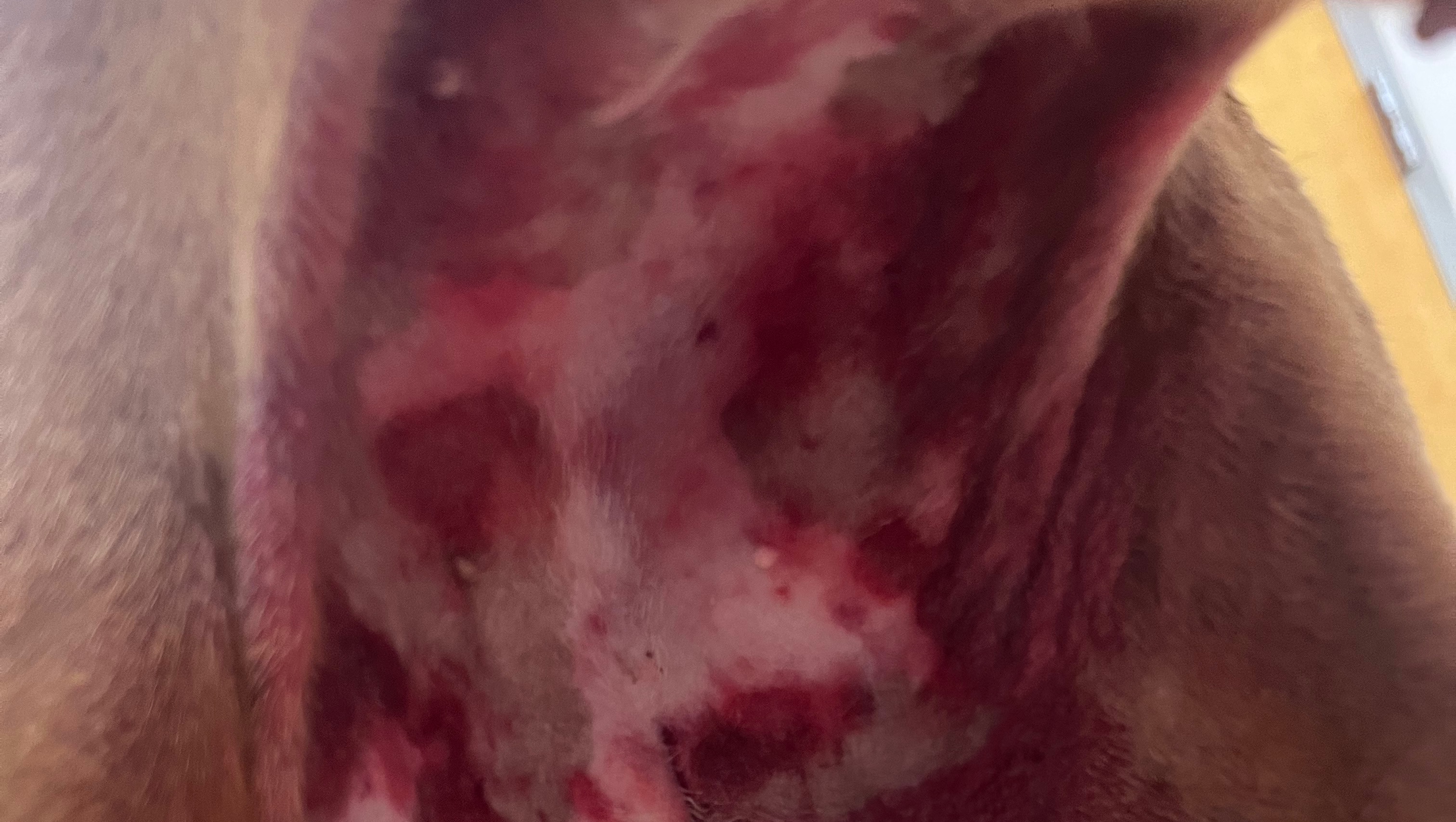 Saturday morning, Pepper woke up and her face was massively swollen. She didn’t even look like herself. We took her to the urgent care vet, and after some Benadryl and a steroid shot, her facial swelling resolved and we were sent home. She started throwing up Sunday, so by Monday we were back at the urgent care vet with the following symptoms: Vomiting for over 24 hours, Rash, Hives, Refusing to eat, Drinking water, but vomiting after.