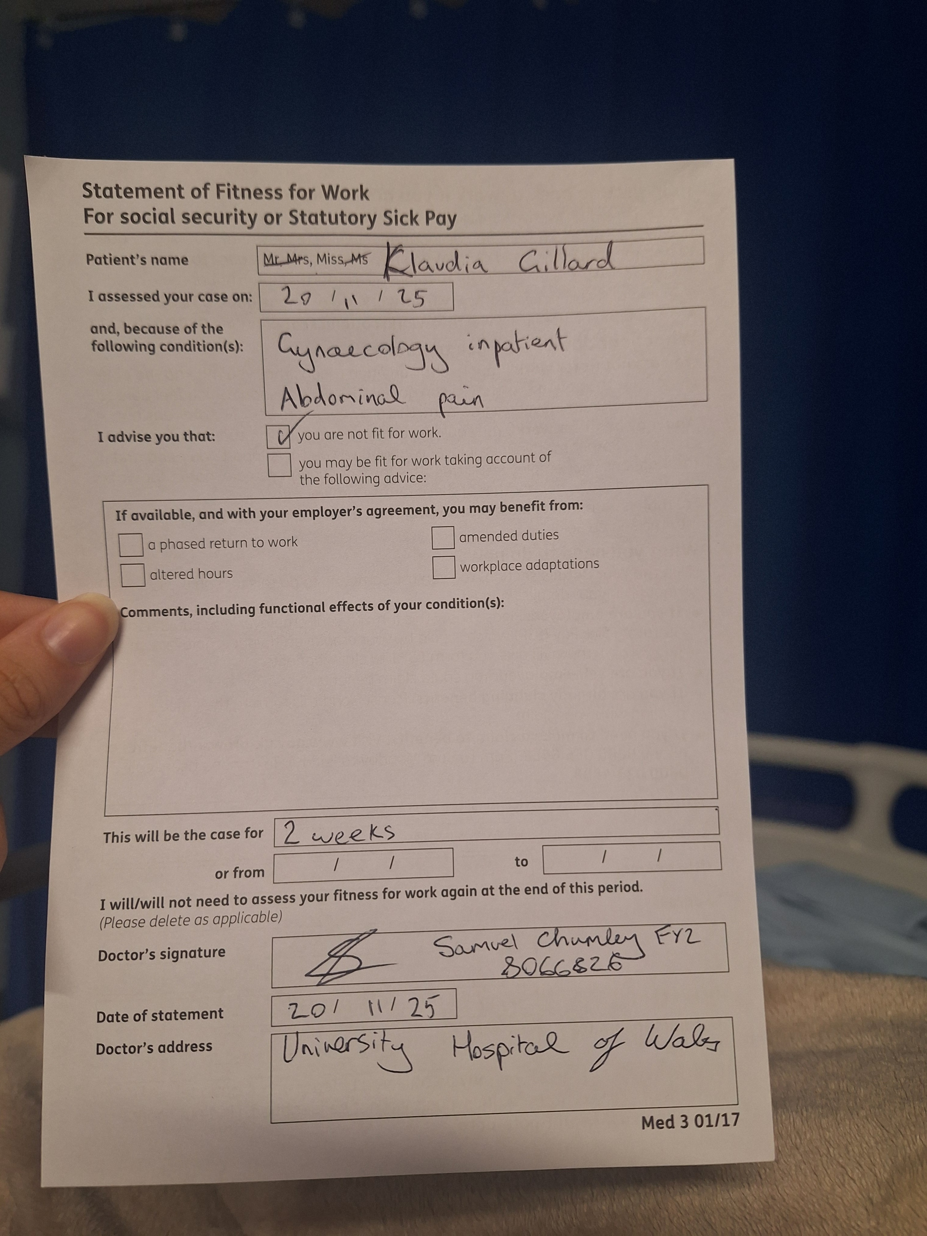 This year has been the hardest of my life. I left my family behind, lived out of a suitcase, and fought tirelessly to find work. After hundreds of applications, I finally secured a job and managed to rent my own apartment. I thought things were finally turning around. But since February 2025, my health has collapsed. I discovered a lump near my ovary and was repeatedly dismissed by doctors, told it was “just constipation.” Months later, I was hospitalised with unbearable pain, a 40°C fever, and bleeding. Investigations revealed abnormal ovaries, swollen lymph nodes, and internal bleeding in my uteras and some traces of blood in my urine — yet no clear answers answer from doctors. The only response from the doctors when I was hospitalised in may 2025 for this was that it was because I am a young female who was sexually intimate in the past. The pain never stopped. It worsened. I became so fragile that even walking was impossible. I lost weight, developed nosebleeds, and grew weaker by the day. Despite countless hospital visits, I was dismissed again and again. In November, things reached breaking point. I felt a “pop” in my stomach, followed by searing pain spreading through my abdomen, back, and legs. I was hospitalised again, unable to walk, vomiting frequently, and reliant on friends to carry me up and down stairs. Doctors suspected ovarian torsion, then scar tissue blocking my intestines, but they pain was not today with my 8ntest8nes it was rather more my ovaries more in my gentile area, when they prefformed a transvaginal scan it was unbearbale pain, and yet i was still offered no lasting treatment — only more pain medication that barely works. While enduring this, my manager harassed me daily, demanding medical details and pressuring me to discharge myself from hospital. He has refused to pay me while I am signed off sick, leaving me unable to afford rent, food, or even basic necessities. His sexist remarks and threats have added unbearable stress to an already devastating situation. Why I Need Help Right now, I am in constant pain, unable to walk without assistance, and facing the risk of losing my home. I urgently need a proper wheelchair to regain some independence, and financial support to cover rent, food, and essentials — especially with Christmas approaching. I have fought so hard to build a life on my own, but my health and circumstances have left me in a desperate position. Any donation, no matter how small, will make a huge difference. Thank you for taking the time to read my story and for supporting me through this battle.