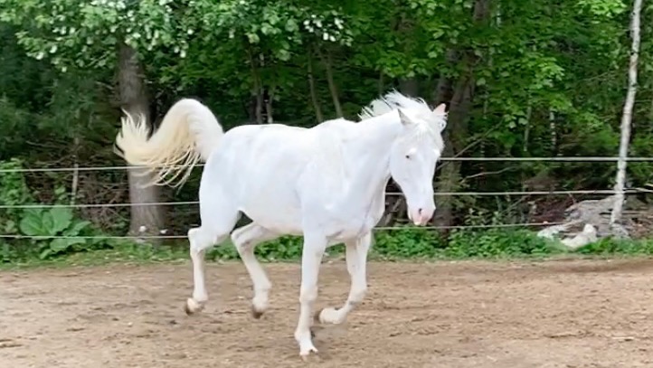 Odie is a Medicine Hat Paint, who is white with blue eyes. When he arrived 9 years ago his prognosis was dire. He recovered with the help of the UPEI Veterinary College Team and Angela’s devoted care. There is something that is pure magic about this boy’s gentle nature, intuitiveness and playful soul.