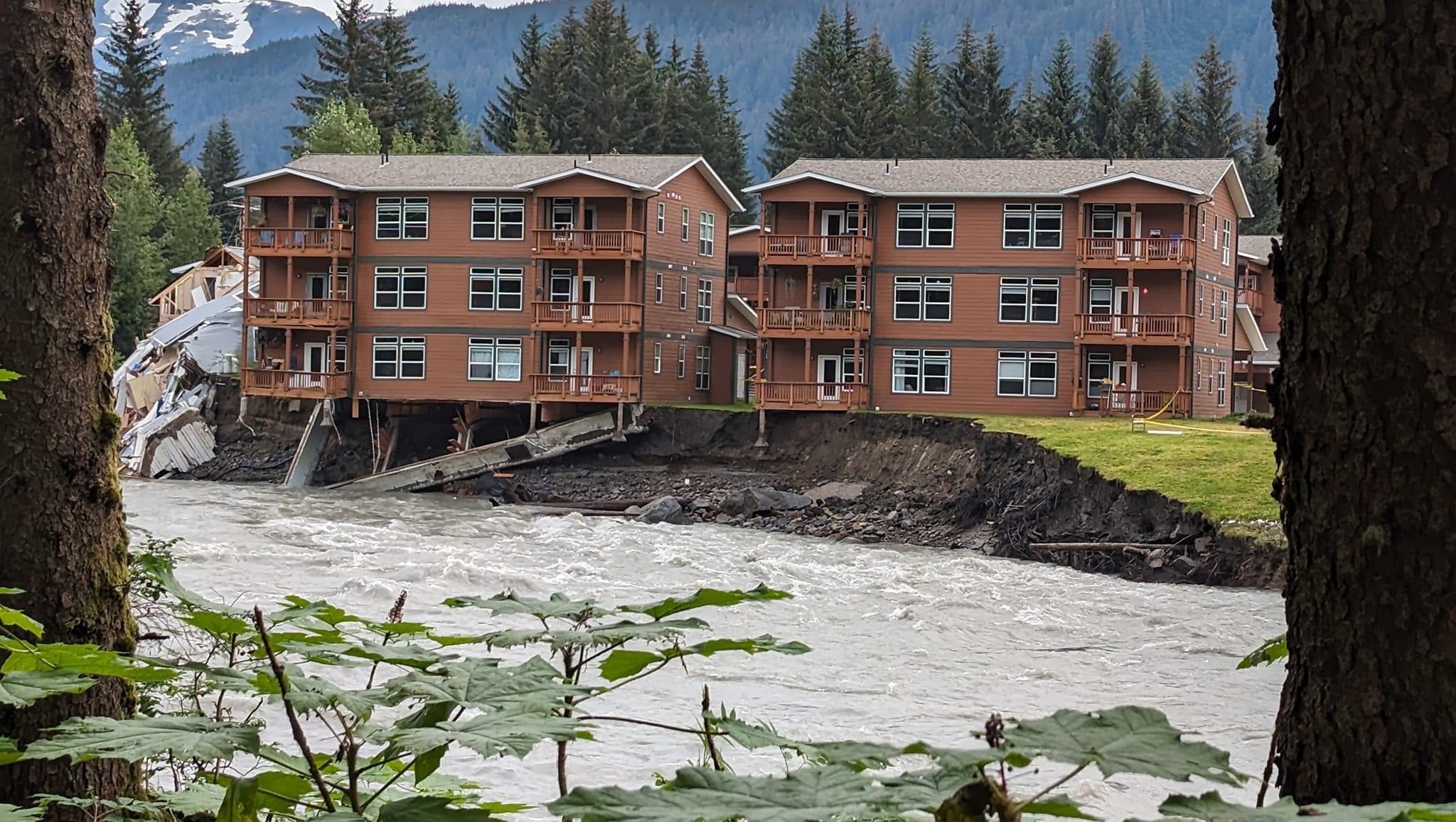 On the afternoon of Saturday, August 5th, Laurie was visiting friends when she was called by her neighbor to return home because they were being evacuated. She would only have a few minutes to grab any belongings she could. An unprecedented flooding event on the Mendenhall River in Juneau, Alaska caused by a break in a glacial dam. The flood waters rapidly rose, and the river carved a new path taking out trees, 50 feet of land and part of the foundation under the entire building where she lives and owns. Her’s is the unit on the second floor, right hand side as viewed from the river, suspended over the river. Because she was away from her condo at the time, when she returned home Laurie was only able to grab minimal essentials with the help of two bystanders. The building is now condemned and no one is able to retrieve any more of their belongings. There is hope that the building will again become habitable in a few months.