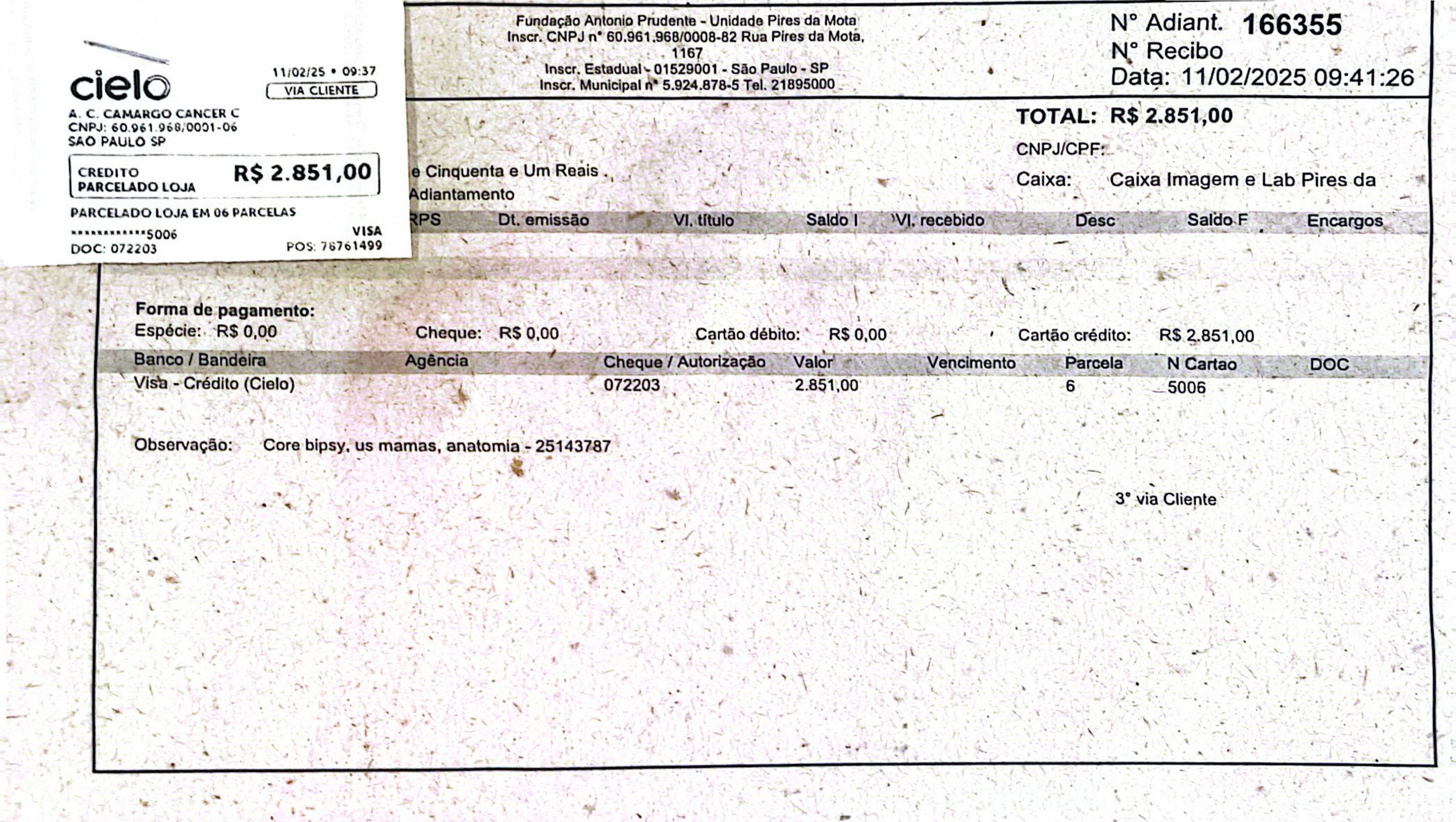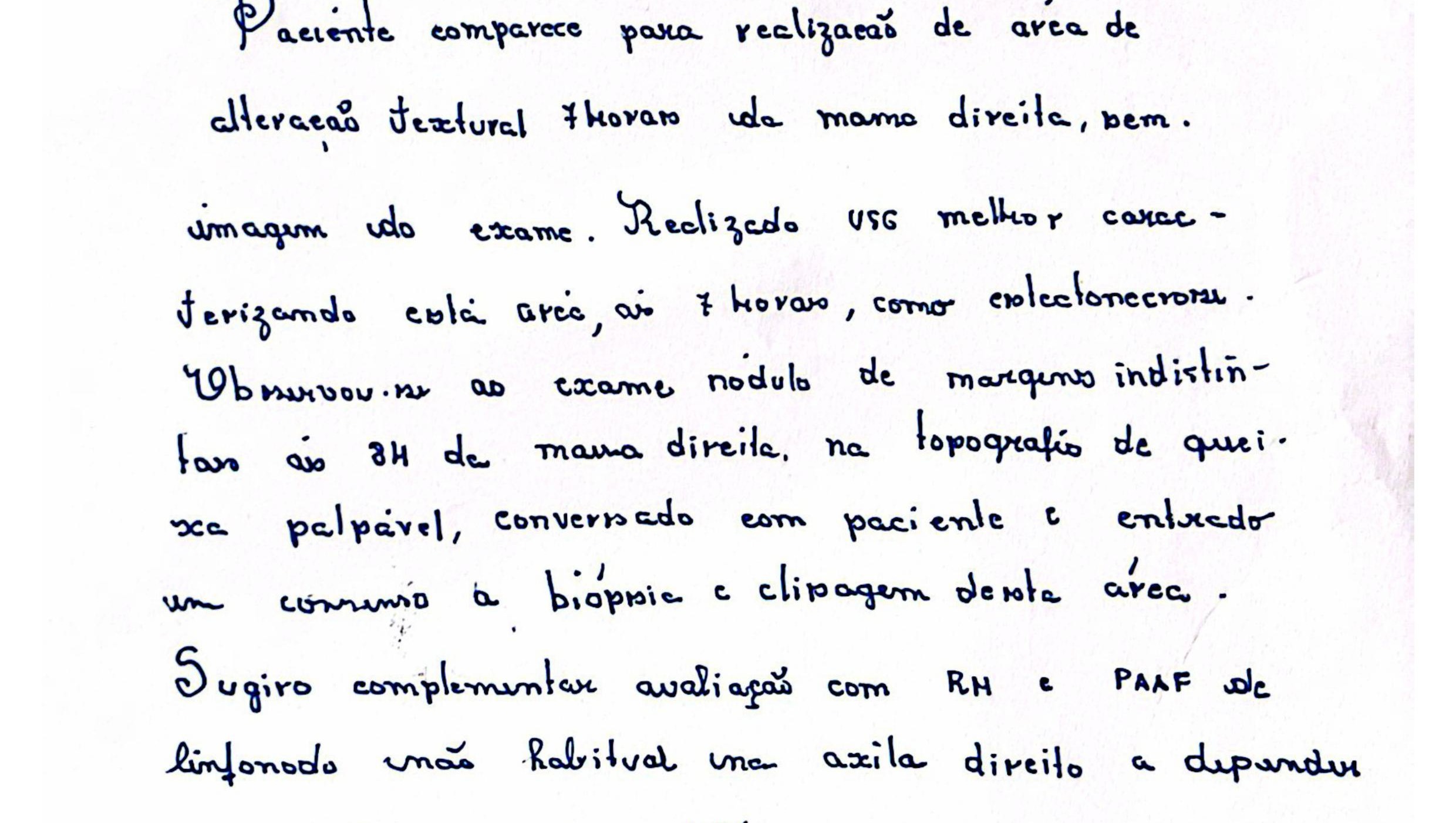 On February 6, I decided to go to São Paulo, to the public emergency room where I was seen and had a breast ultrasound which identified a suspicious lump (ACR BI-RADS 4) and requested a biopsy to follow appropriate treatment, and without the result of the biopsy I can't take any pain medication. However, the result of the biopsy by the public system takes 45 days and as it is progressing rapidly we decided to do the tests with a private hospital.