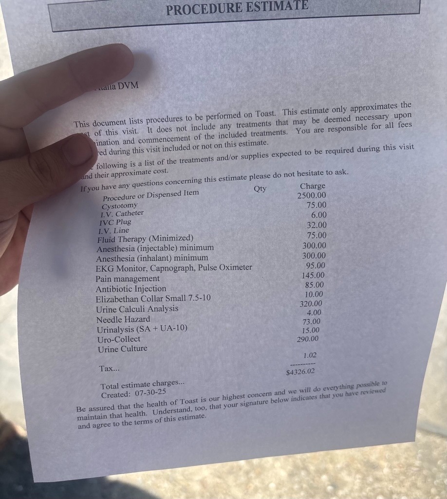 Our 9-year-old stinky Toast is in need of an emergency surgery. After taking him to the vet today, they discovered he has stones in his urethra that can be fatal without a cystotomy in the next 24-48 hours. If not treated as soon as possible, he will be in constant pain and struggling to the point where the vet suggested the only option would then be to put him down.
