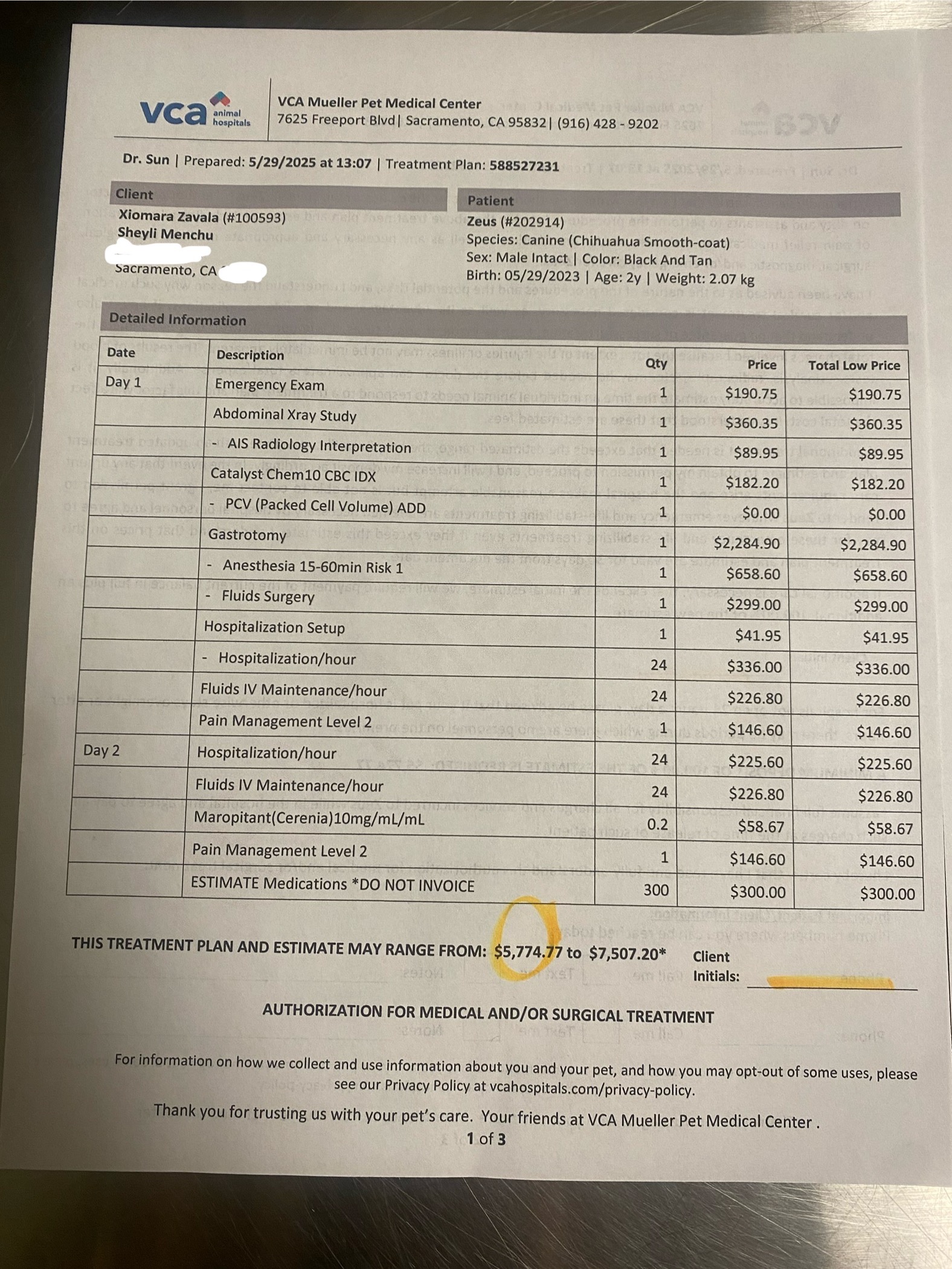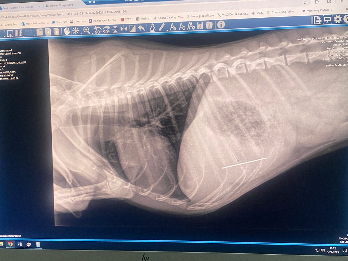 We rushed him to VCA Mueller Pet Medical Center in Sacramento, where they confirmed through X-rays that the needle is inside his body and surgery is the only way to prevent serious internal damage or worse. The estimate for his care and surgery ranges between $5,774.77 and $7,507.20 . As much as I wish I could cover this on my own, the cost is far beyond what I can afford right now.