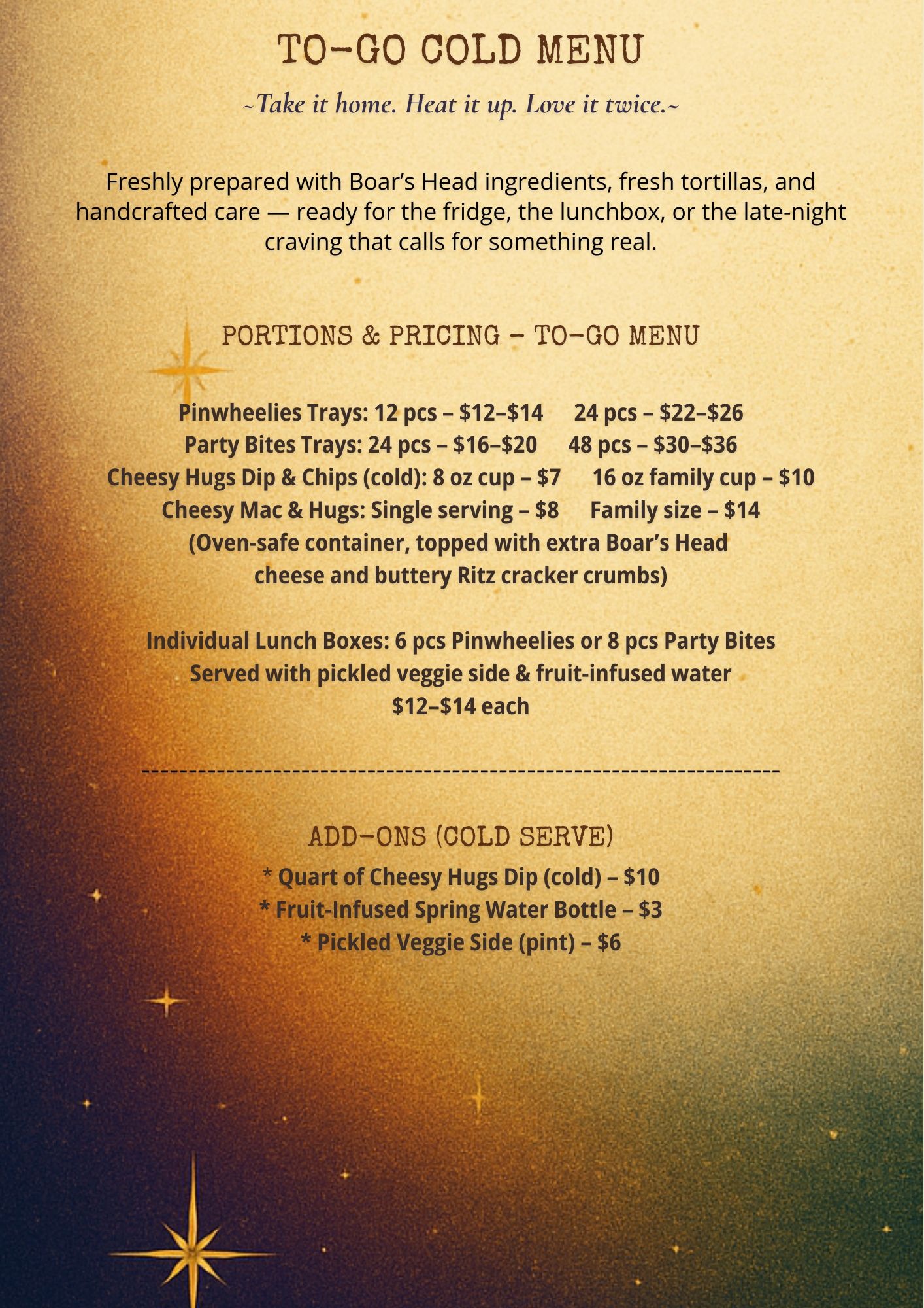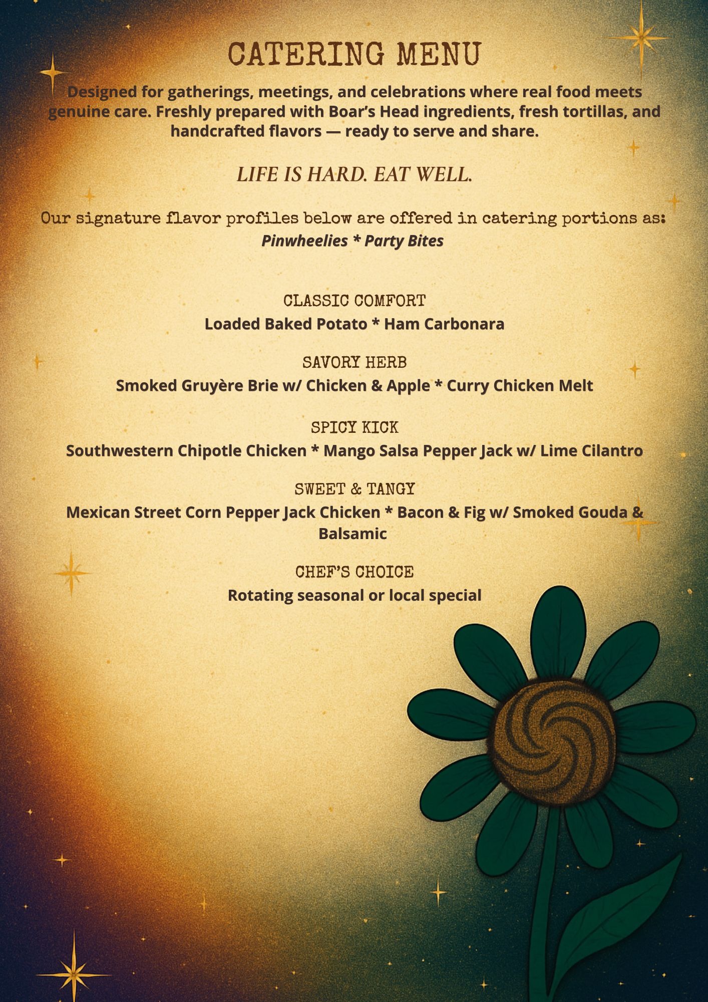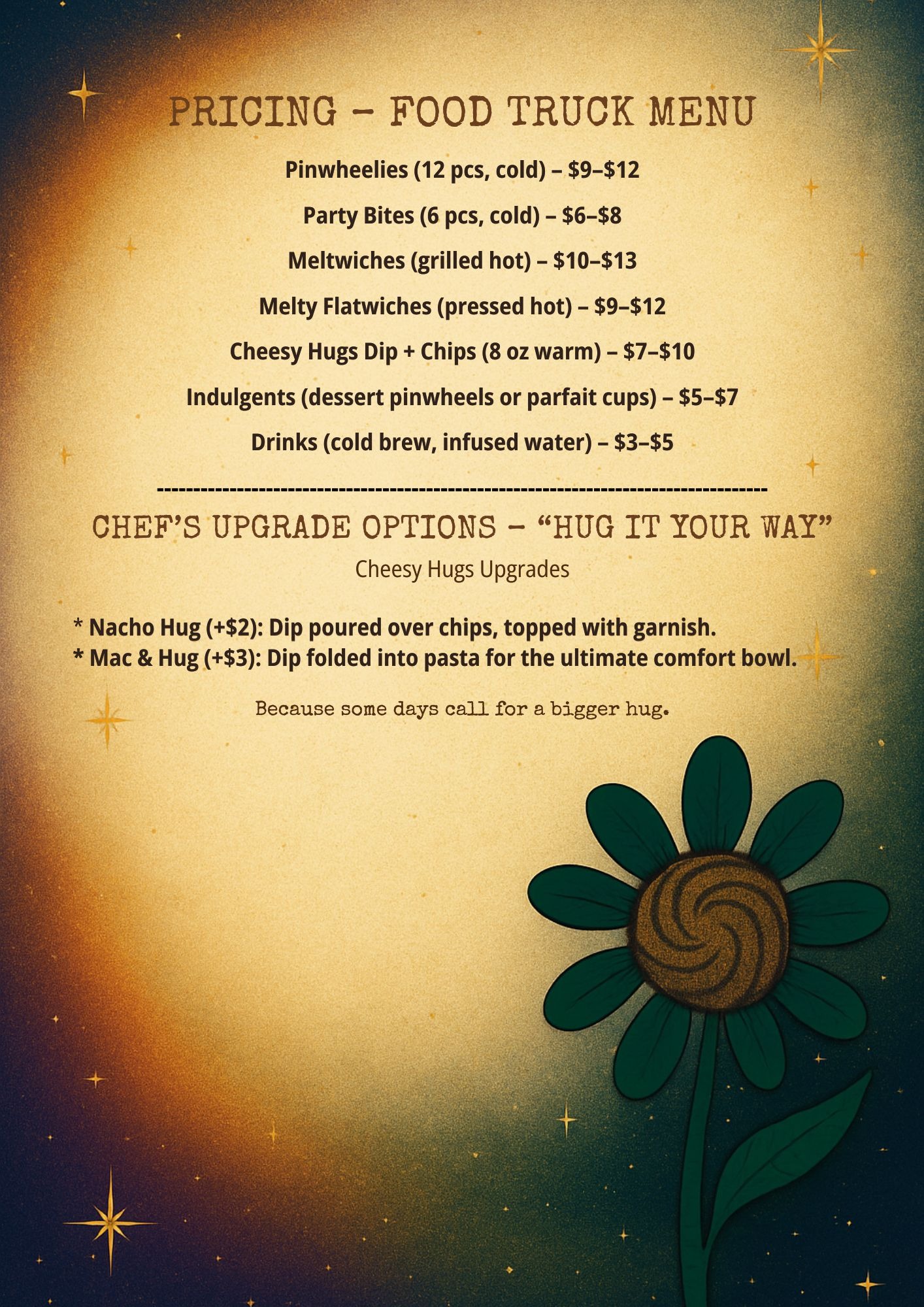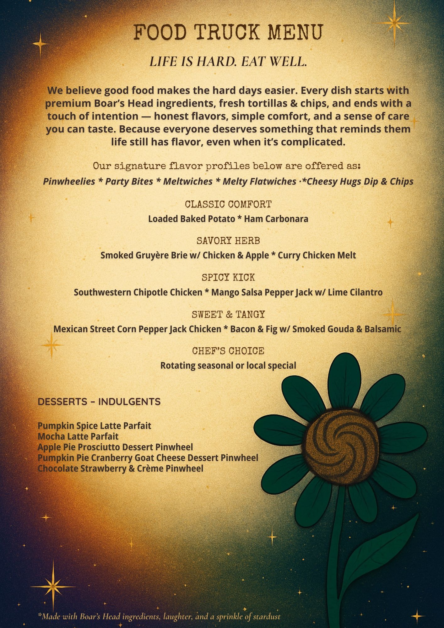 I’m building an American Fusion Gourmet Comfort Food catering and food truck business that serves what people actually crave when life gets overwhelming. I handcraft flavorful pinwheels (Pinwheelies), hot melty sandwiches (Meltwiches), and warm cheese dips (Cheesy Hugs)—all made with premium Boar’s Head ingredients. I’m using a modular format with specific flavor profiles that will be available in different formats to streamline prep and ingredients, minimizing waste.