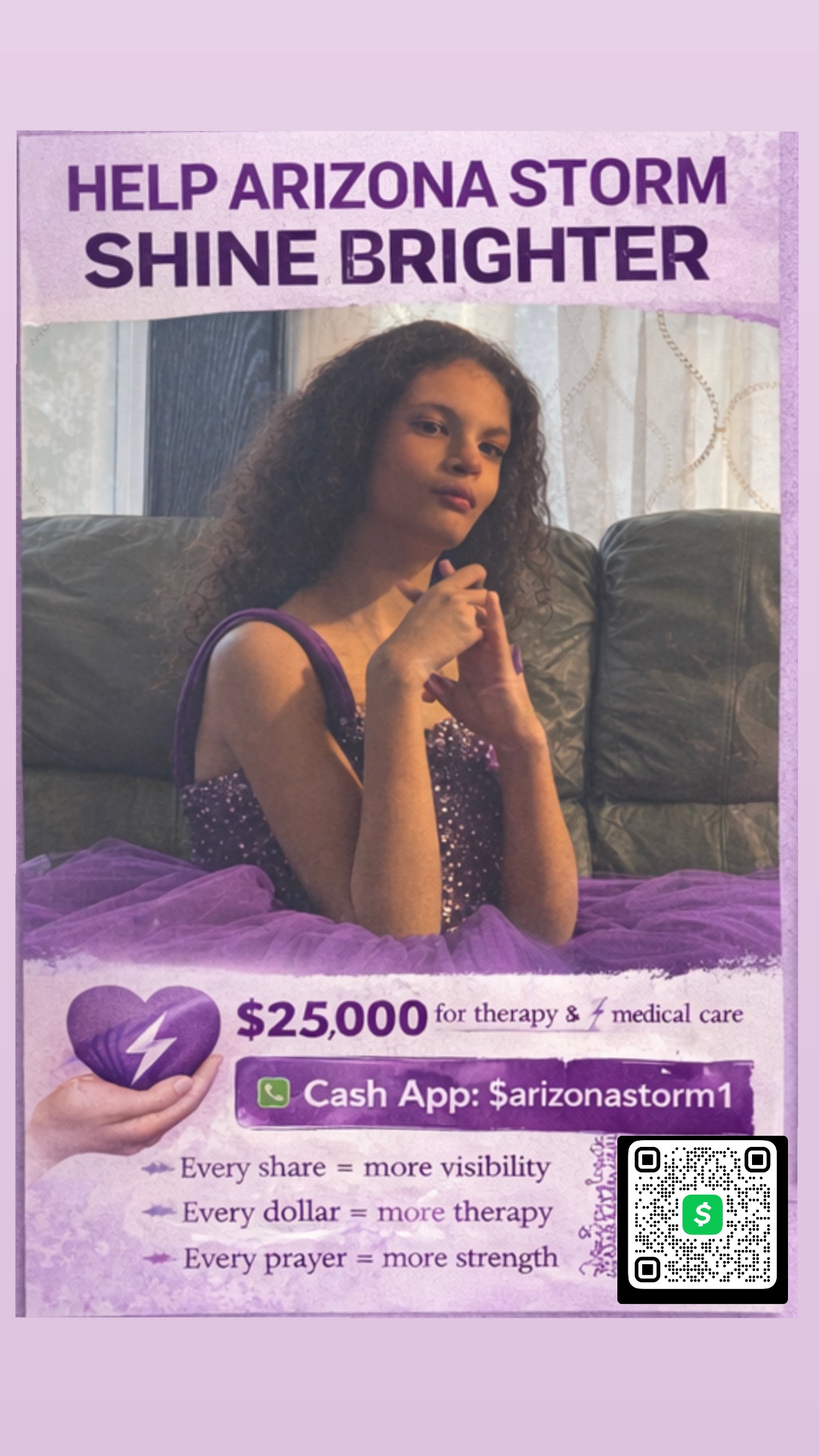 Arizona Storm is my daughter, and she is a bright, resilient young girl living with Cri du chat syndrome—a rare genetic condition that affects her speech, muscle tone, and overall developmental progress. Every day, Arizona faces unique challenges, but her determination and spirit inspire everyone who knows her. As her father, I am committed to giving her every opportunity to thrive, and that means ensuring she receives the specialized care she needs.
