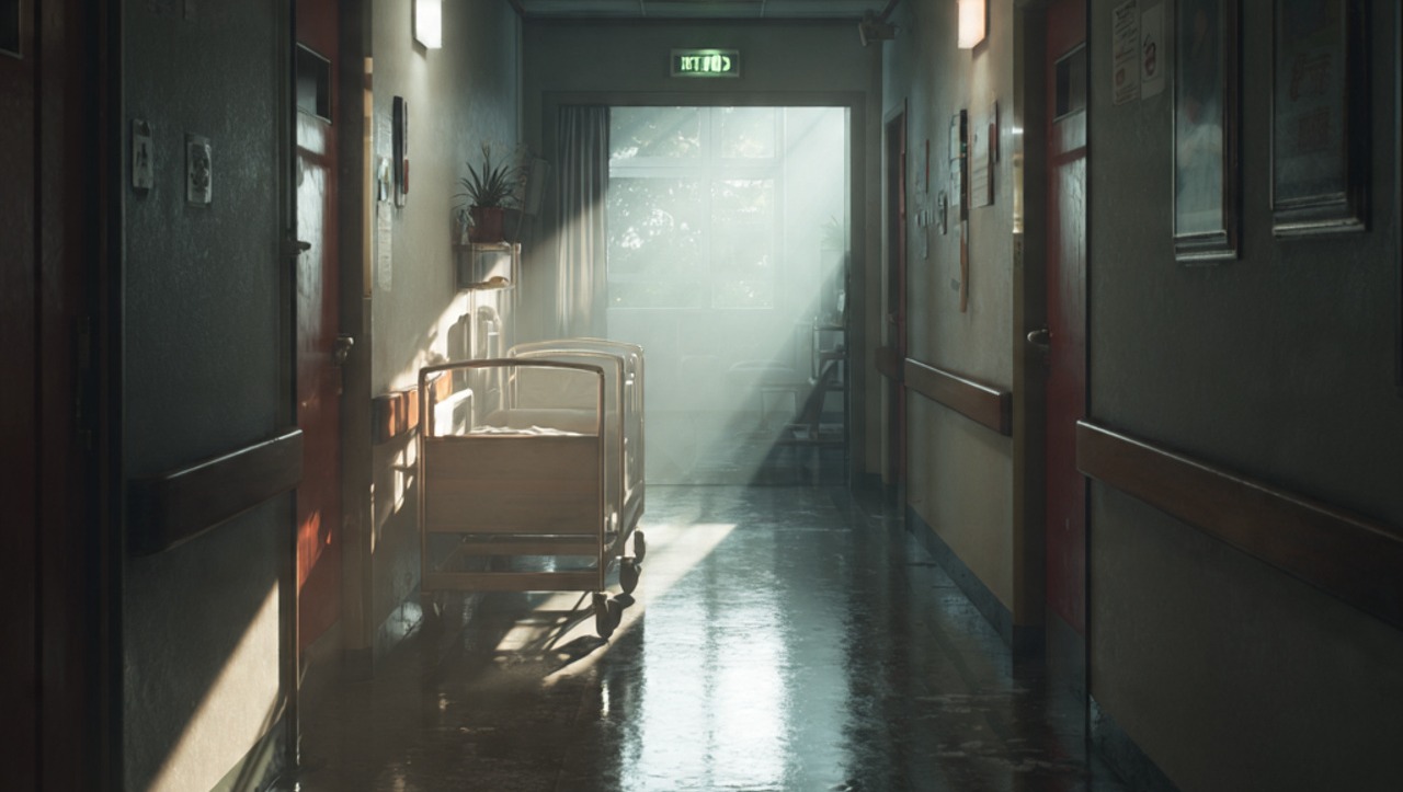 As I am walking back it began to look familiar and it hit me I was going the right direction. The same light reflection you see coming from out of the room in the example image of her room. As I walk quietly towards the hospital room, the bright light spilling out into the hallway, illuminating my concerned expression as I wonder about my mom inside. The fluorescent lights above seem to hum in sync with your footsteps, echoing the anxiety that's building up inside of me. As i take a deep breath, trying to prepare myself for what's to come, my eyes fixed on the area with a mix of worry and hope. For my mom inside as I get closer to the door entrance