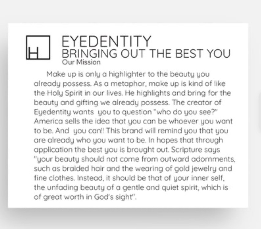 Make up is only a highlighter to the beauty you already possess. As a metaphor make up is kinda like the Holy Spirit in our lives. He highlights and bring forth the beauty and giftings we already possess. The Creator of Eyedentity Michael L Brown II wants you to question yourself “who do you see ? “ America sells the idea that you can be whoever you want to be. In fact, you can! This brand will remind you that you are already who you want to be. In hopes that through application the best you is brung out. Scripture says Your beauty should not come from outward adornments, such as braided hair and the wearing of gold jewelry and fine clothes. Instead, it should be that of your inner self, the unfading beauty of a gentle and quiet spirit, which is of great worth in God's sight.