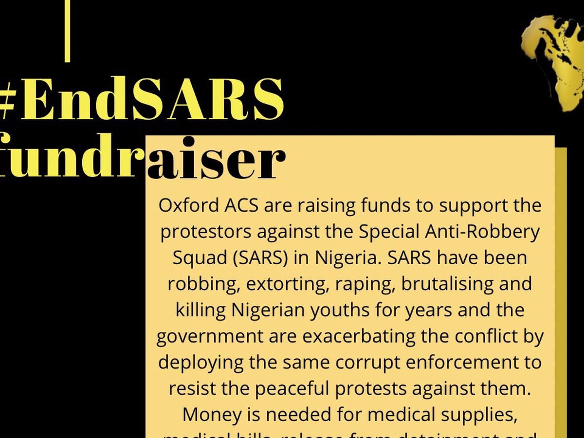 The Oxford ACS are raising funds to support the protestors against the Special Anti-Robbery Squad (SARS) in Nigeria. SARS have been robbing, extorting, raping, brutalising and killing Nigerian youths for years and the government are exacerbating the conflict by deploying the same corrupt enforcement to resist the peaceful protests against them. Money is needed for medical supplies, medical bills, release from detainment and post-detainment therapy. The Nigerian youth need our attention and support now - black lives don’t only matter in the western world.  UPDATE: The purpose of our fundraiser has not changed, however the recipient of the donations has. The feminist coalition have stopped taking donations, as a result we will be splitting the donations equally between Medsaf, who are providing medical support to protestors, and Mentally Aware Nigeria, who are working with #EndSARSMentalHealthSupport. To do this, the Vice President (Effie) will withdraw the funds and transfer all donations via online bank transfer. Thank you for your dedication to the cause and your patience with the fundraiser.