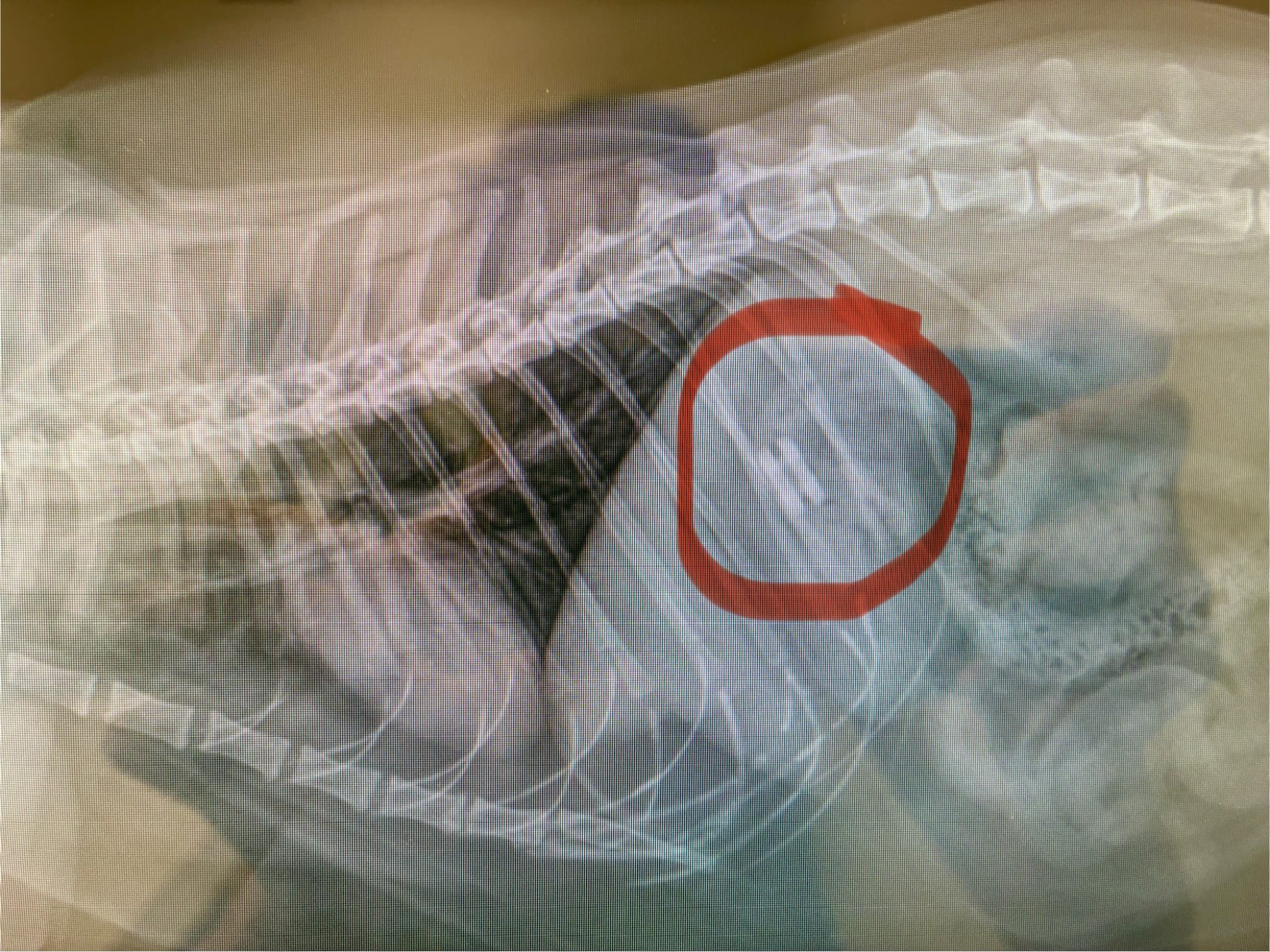The x-ray shows that Enfoiré has a foreign object stuck in his stomach. Not removing it has the potential to escalate things if the object moves lower in his intestine.