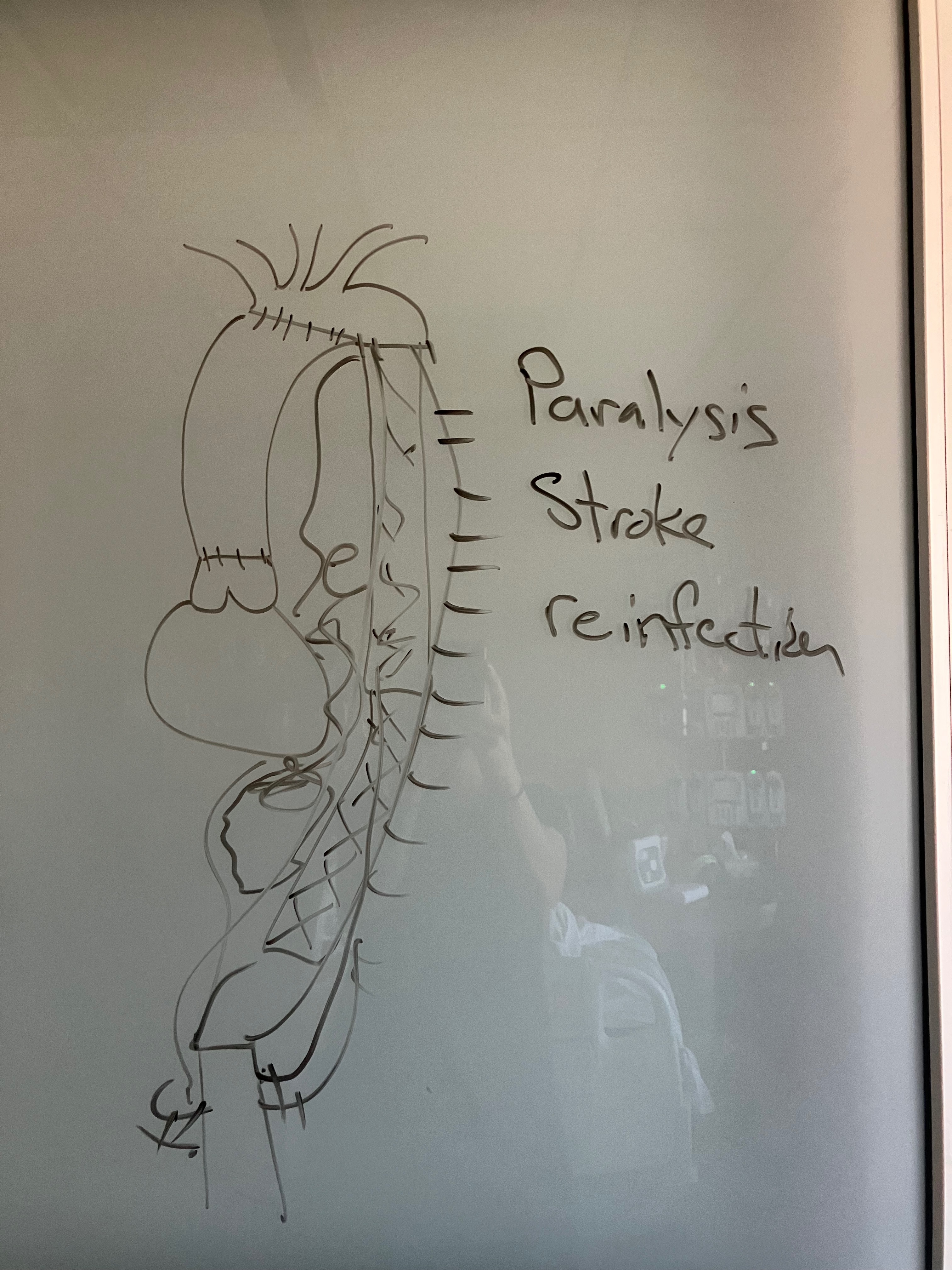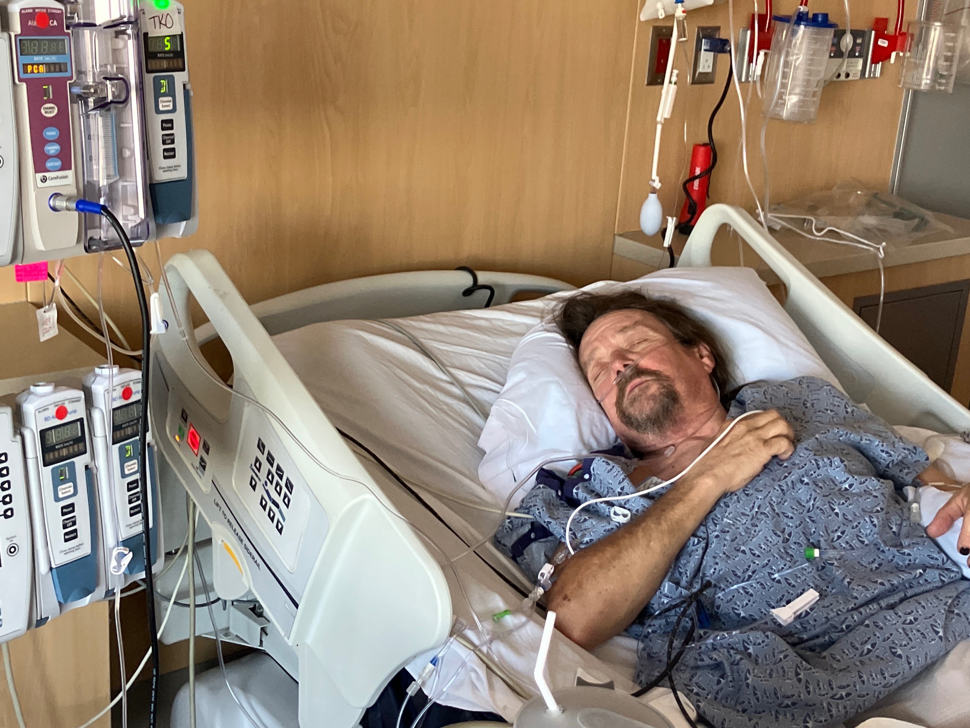 After surgery, they were trying to wake him up out of the anesthesia but he started panicking once he started coming to awareness. Since they performed the surgery through his back, they had to insert a catheter in his back to hook him up to a spinal drain machine to prevent swelling, which could put pressure on his spinal column and cause nerve damage.
