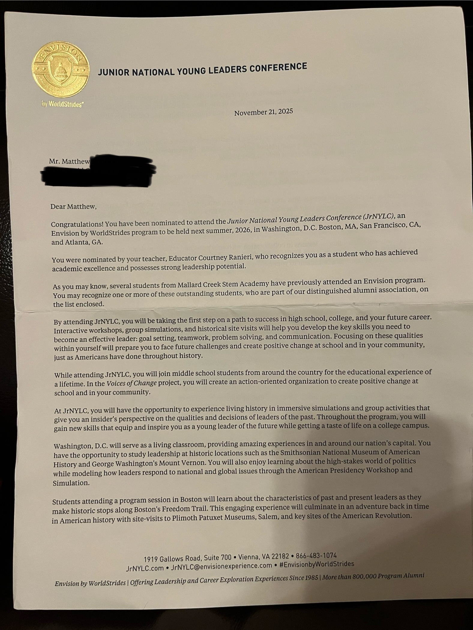 Hi, my name is Matthew, and I’m 10 years old. I was nominated into the JRNYLC program by my Art teacher, Ms. Raineri. I was also nominated because I excel in academics, as well as my leadership. I would be very appreciative if you helped me go to this program. I also have some interests of mine that I will include: