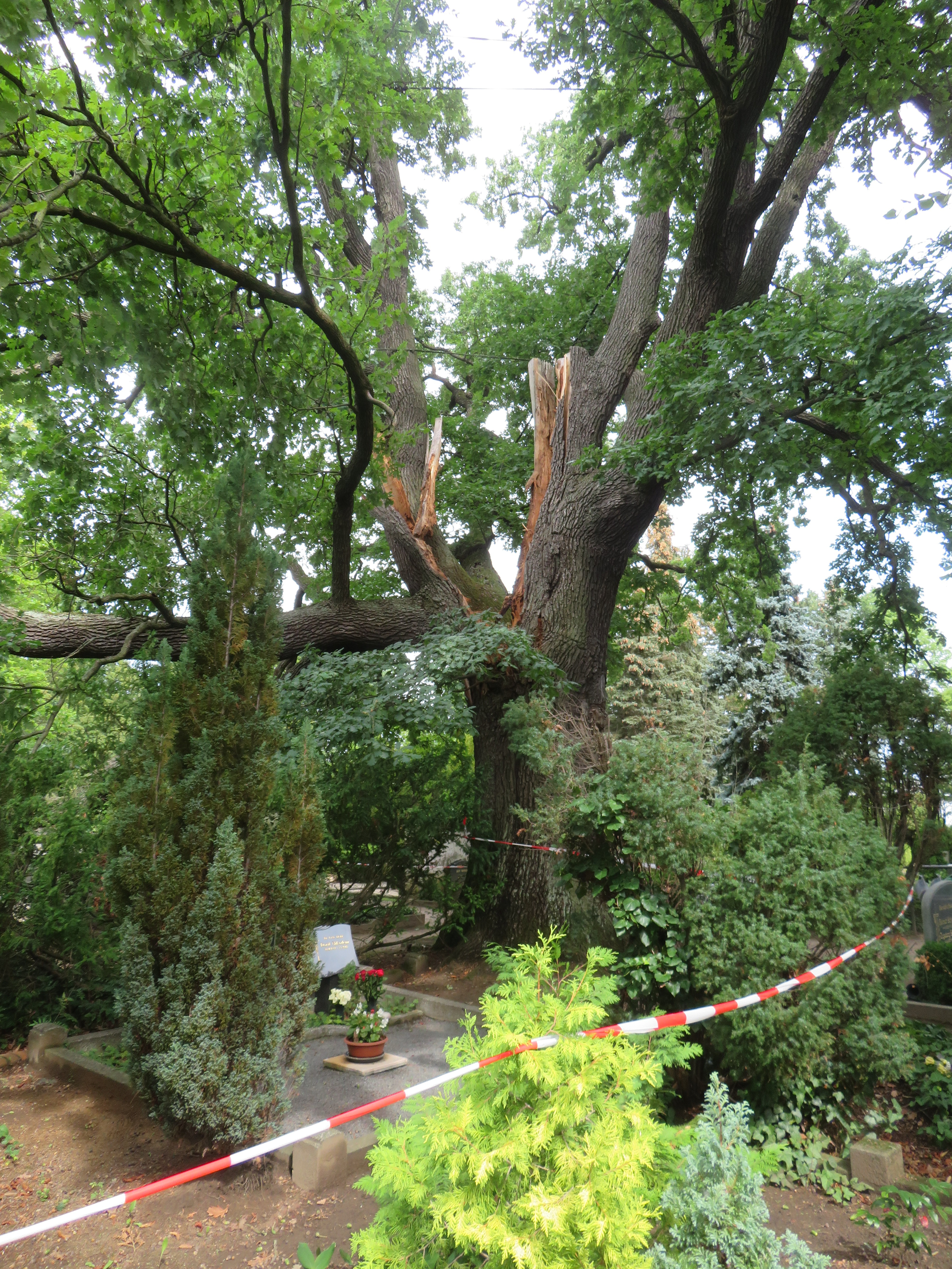 Die Eiche soll jedoch unbedingt erhalten werden, da sie prägend für das Bild des Friedhofs ist. Nicht zuletzt erfüllt solch ein großer Baum viele wichtige Aufgaben: als Sauerstoffproduzent für frische gesunde Luft, als Staubfilter, als Lebensraum für zahlreiche Tierarten, als Schutz vor Bodenerosion, als Erhalter des Wasserkreislaufs und nicht zuletzt als wohltuender Schattenspender.