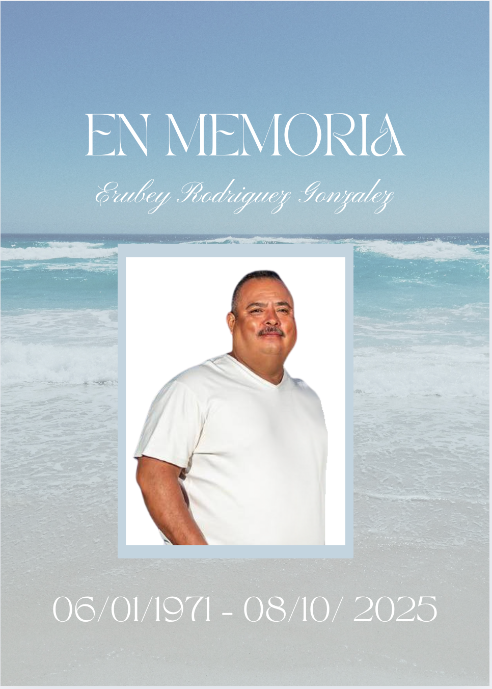 Today, we gather to honor and remember Erubey Rodriguez Gonzalez whose life was filled with strength, laughter, and love. He was a great husband, father, uncle, brother, and friend — someone who touched the hearts of everyone he met.