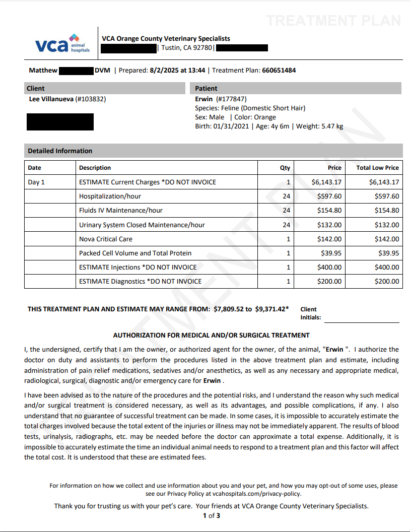 So far, I’ve paid $5,608.94, with $4,100 of that coming from a Care Credit loan. This doesn’t include the $2,200 generously contributed by the Animal Assistance League of Orange County, which covered three nights of emergency care. I’ve now exhausted my savings and have been selling my belongings and reaching out to local organizations for additional help.