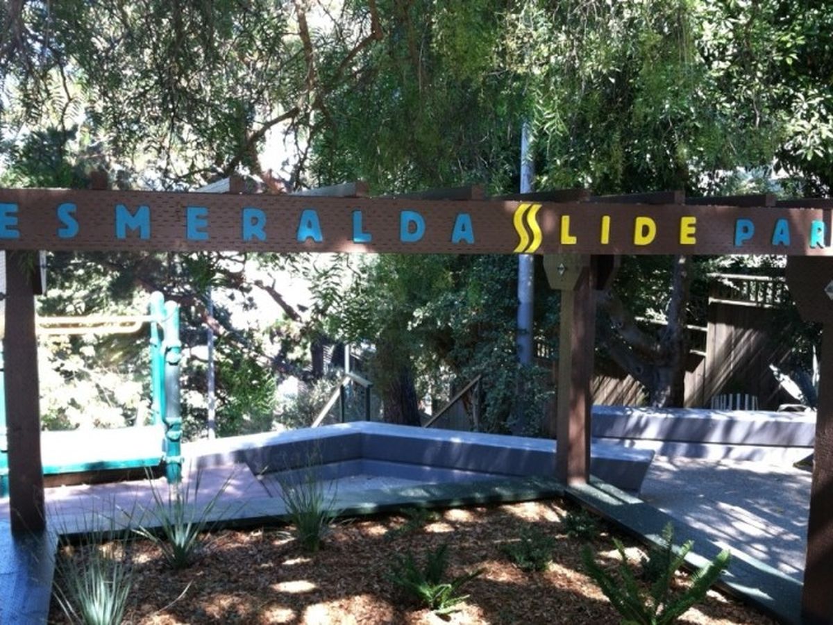 Esmeralda Slide Park, between Prospect Ave. and Winfield St., is uniquely positioned along a public stairway in West Bernal. It is not only a thoroughfare for local neighbors, but also a destination for travelers from SF and beyond (see NY Times). We have an amazing double slide, a landscaped hillside, and a plaza with benches, and a picnic table.