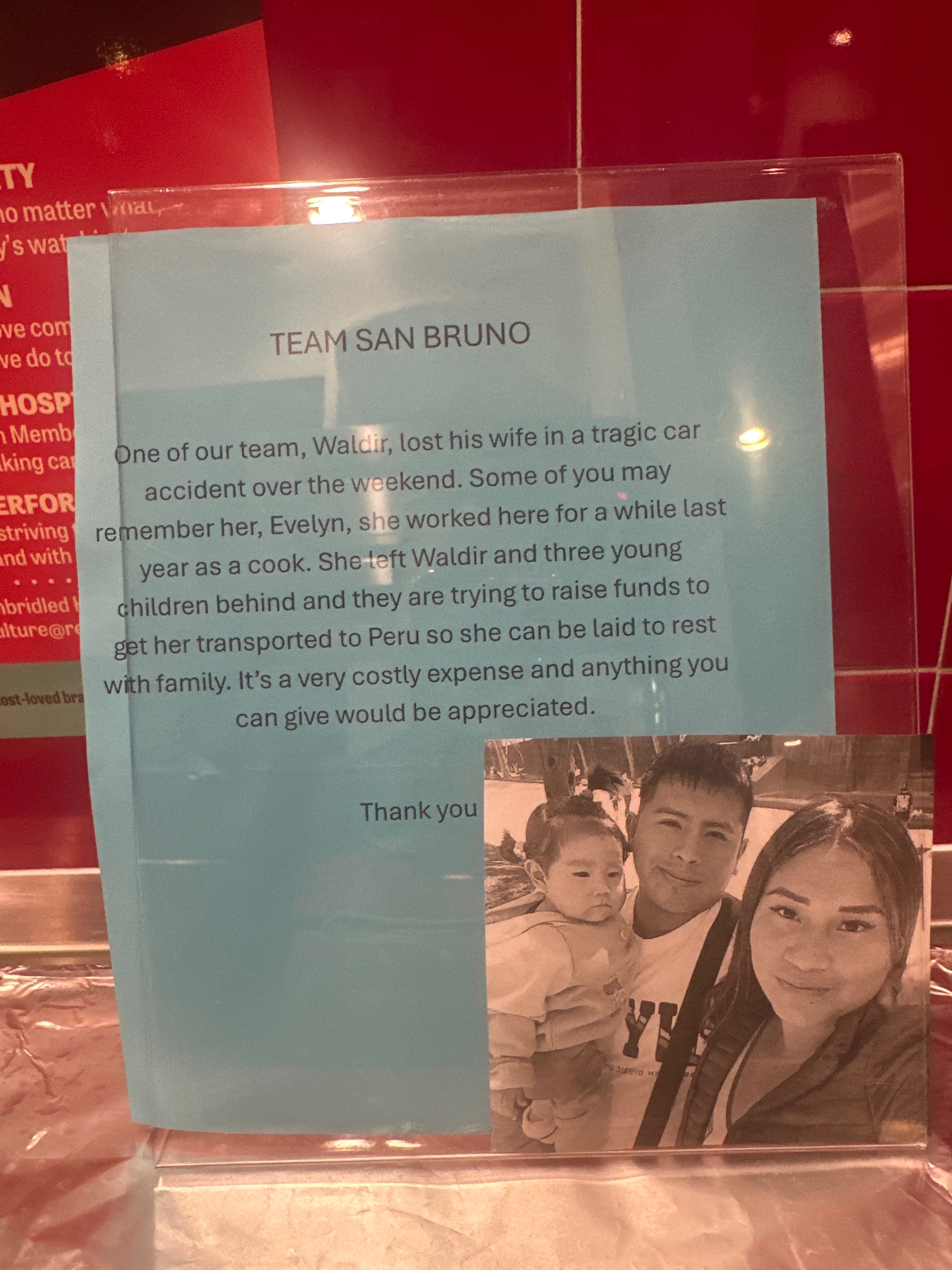 • Hola me llamo waldir estamos recolectando fondos para repatriar el cuerpo de mi esposa Evelin Mamani para nuestro país Perú estos fondos serán de mucha ayuda ya que ella deja 3 hijos 2 están esperando por ella en Perú y sus padres y hermanos y demás familiares para darle cristiana sepultura una niña aki en EEUU esperamos contar con su apoyo familia Doliente Flores Mamani y cualquier ayuda será bienvenida de antemano muchas gracias y bendiciones