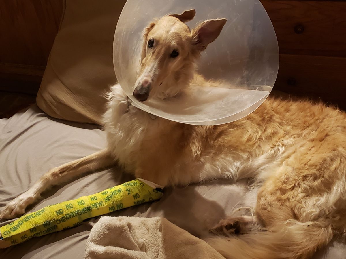 Hi, my name is Alex. My beautiful borzoi Evie broke her leg Thursday night [1/19/23].